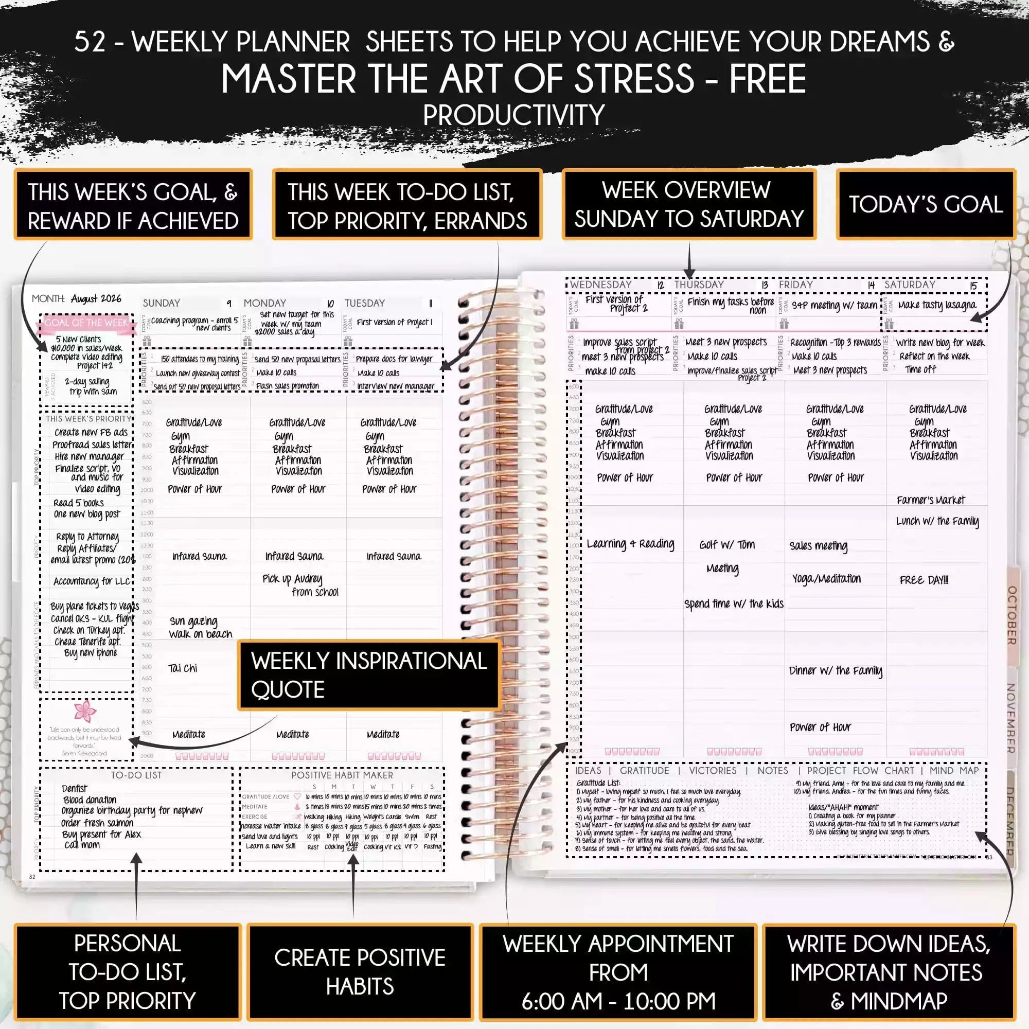💎 CLASSIC + TOP QUALITY: Beautiful rose gold durable soft cover made from animal-friendly PU leather with artwork. Ideal for both women and men, perfect for entrepreneurs, professionals, college students and everyone who has burning desire to turn dreams into reality! FREE VIDEO MINI-COURSE: You will learn a 10-minute morning routine used by the most successful people to tenfold your productivity, focus, happiness, and passion! You will master setting goals and fix procrastination!