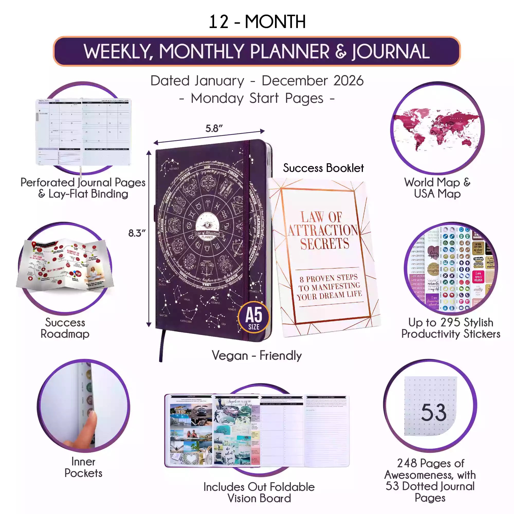 BOGO: Jan - Dec 2026 Dated Monday Start Deluxe LOA 12 Month Planner (A5 Size: 6 x 8.5 inches) Purple Astro