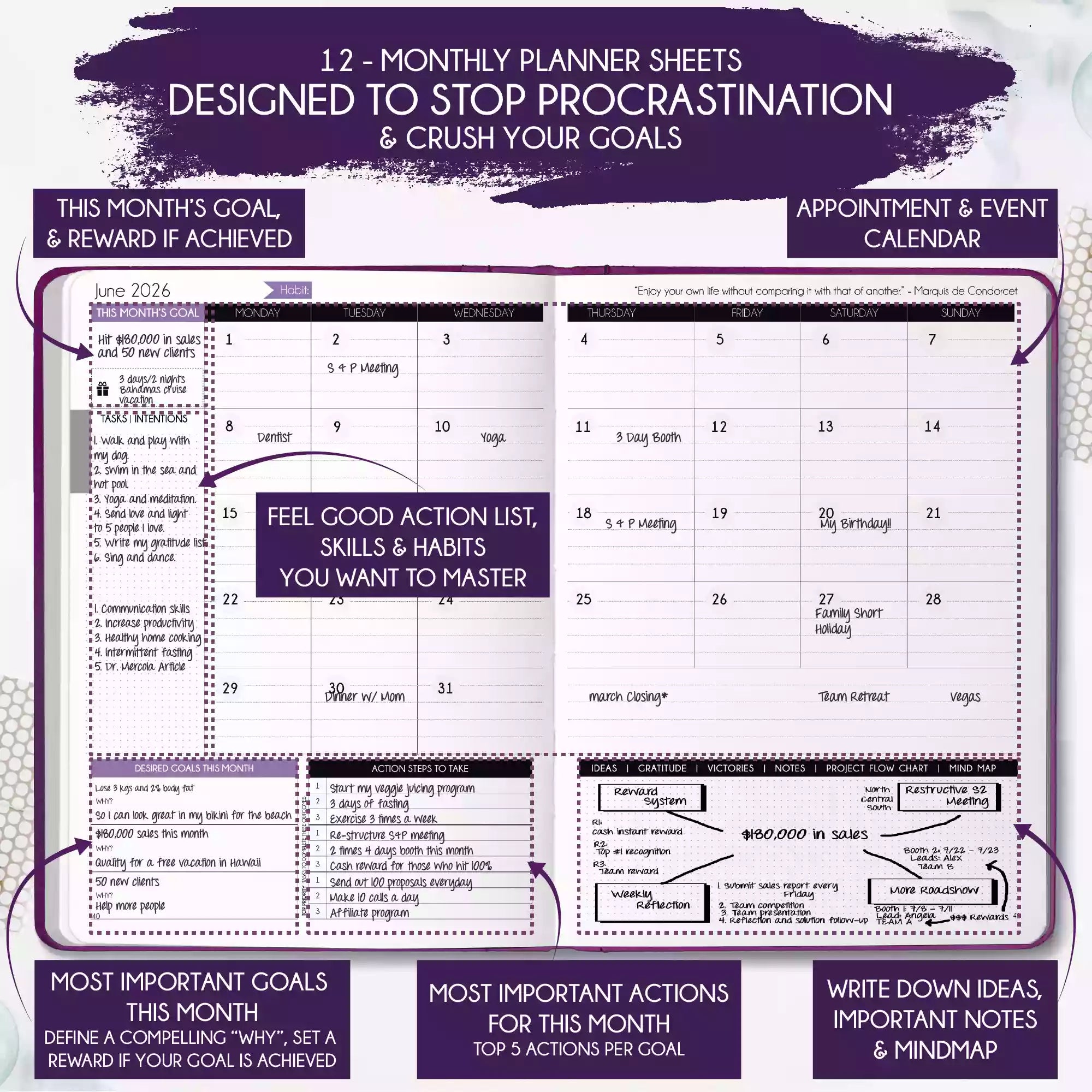 💎 ACHIEVE YOUR GOALS AND IMPROVE TIME MANAGEMENT - Learn How To Set Big Goals and achieve them by improving your time management - Follow the same methods millionaires and billionaires around the world follow to set goals and achieve them. You will be amazed by the results if you follow the 8 steps in this planner! FIND YOUR LIFE PURPOSE AND LIVE YOUR PASSION - Discover what you truly want in your life. Following your passion and purpose will give you more joy than you ever imagined.