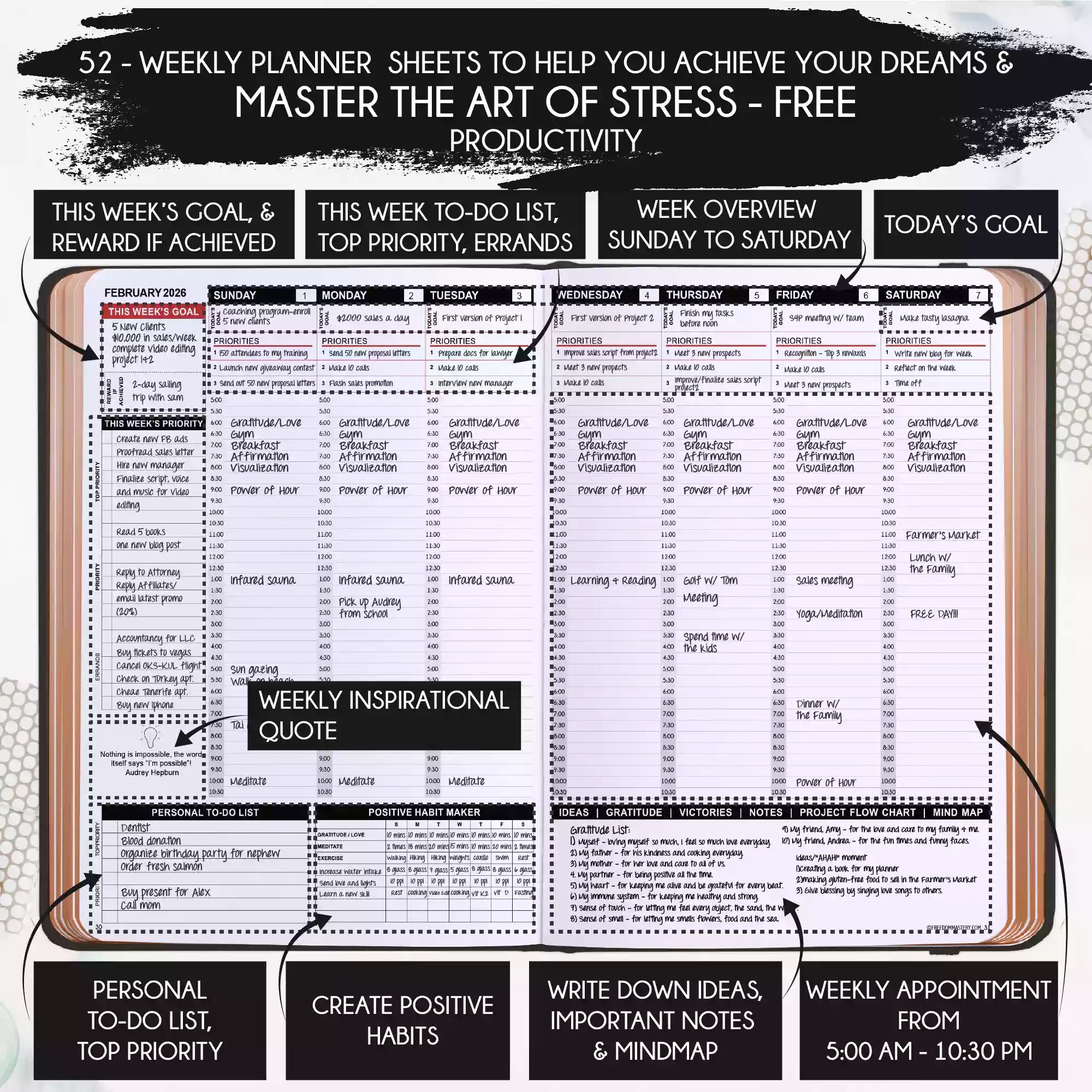💎 CLASSIC + TOP QUALITY: Beautiful rose gold durable soft cover made from animal-friendly PU leather with artwork. Ideal for both women and men, perfect for entrepreneurs, professionals, college students and everyone who has burning desire to turn dreams into reality! FREE VIDEO MINI-COURSE: You will learn a 10-minute morning routine used by the most successful people to tenfold your productivity, focus, happiness, and passion! You will master setting goals and fix procrastination!
