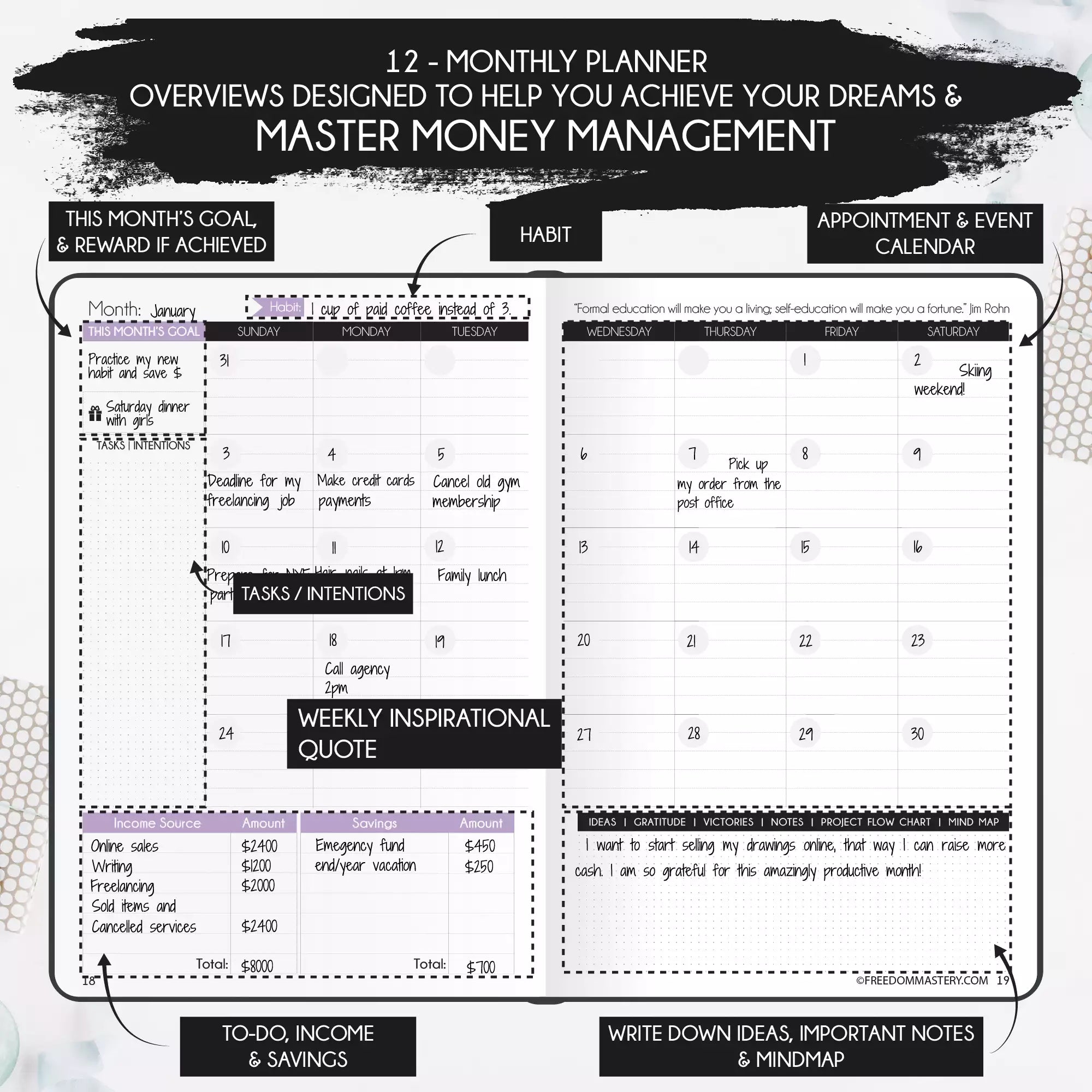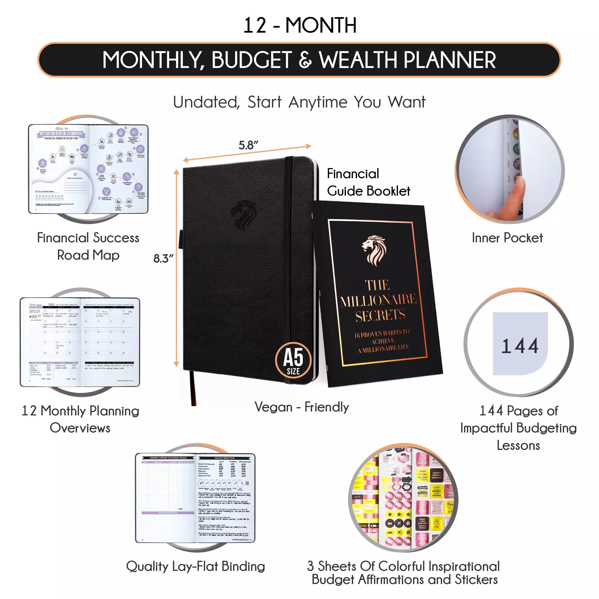 💎 THIS IS A DELUXE UNDATED BUDGET & WEALTH PLANNER showing you how to reprogram your mind to master financial success. It helps you to find a way to pay off your debts, track your expenses, increase savings, and build emergency fund.