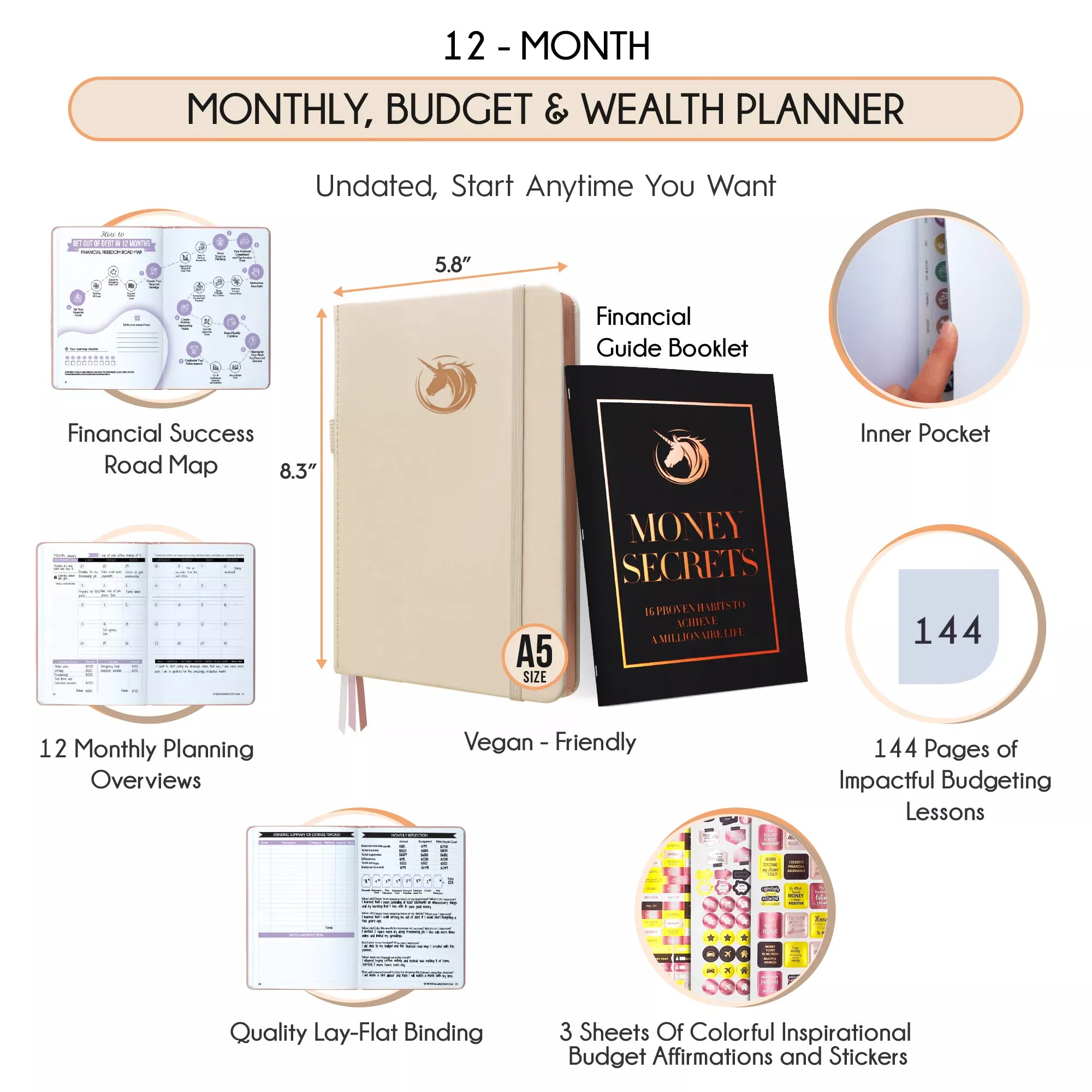 💎 THIS IS A DELUXE UNDATED BUDGET & WEALTH PLANNER showing you how to reprogram your mind to master financial success. It helps you to find a way to pay off your debts, track your expenses, increase savings, and build emergency fund.