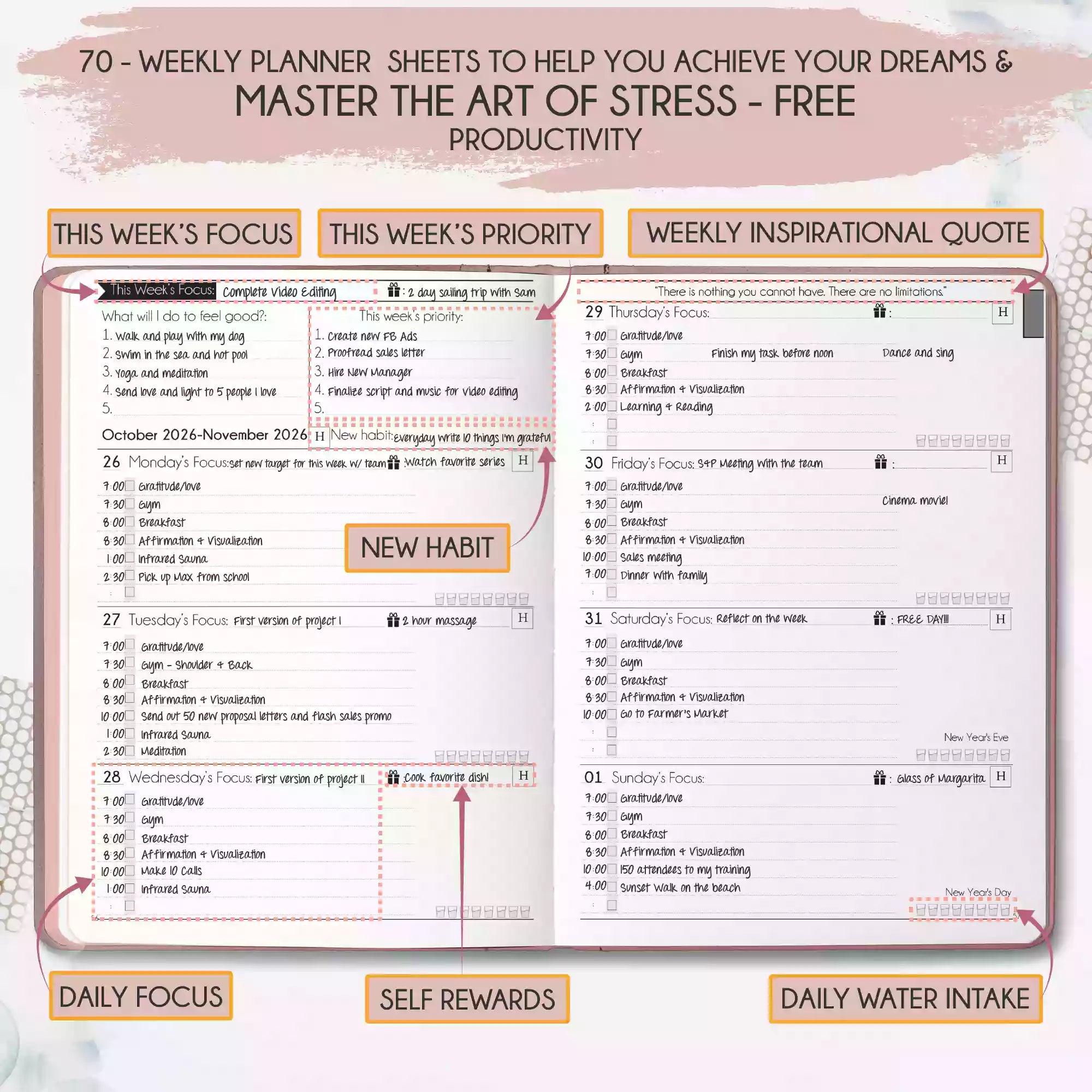💎 CLASSIC + TOP QUALITY: Beautiful rose gold durable soft cover made from animal-friendly PU leather with artwork. Ideal for both women and men, perfect for entrepreneurs, professionals, college students and everyone who has burning desire to turn dreams into reality! FREE VIDEO MINI-COURSE: You will learn a 10-minute morning routine used by the most successful people to tenfold your productivity, focus, happiness, and passion! You will master setting goals and fix procrastination!
