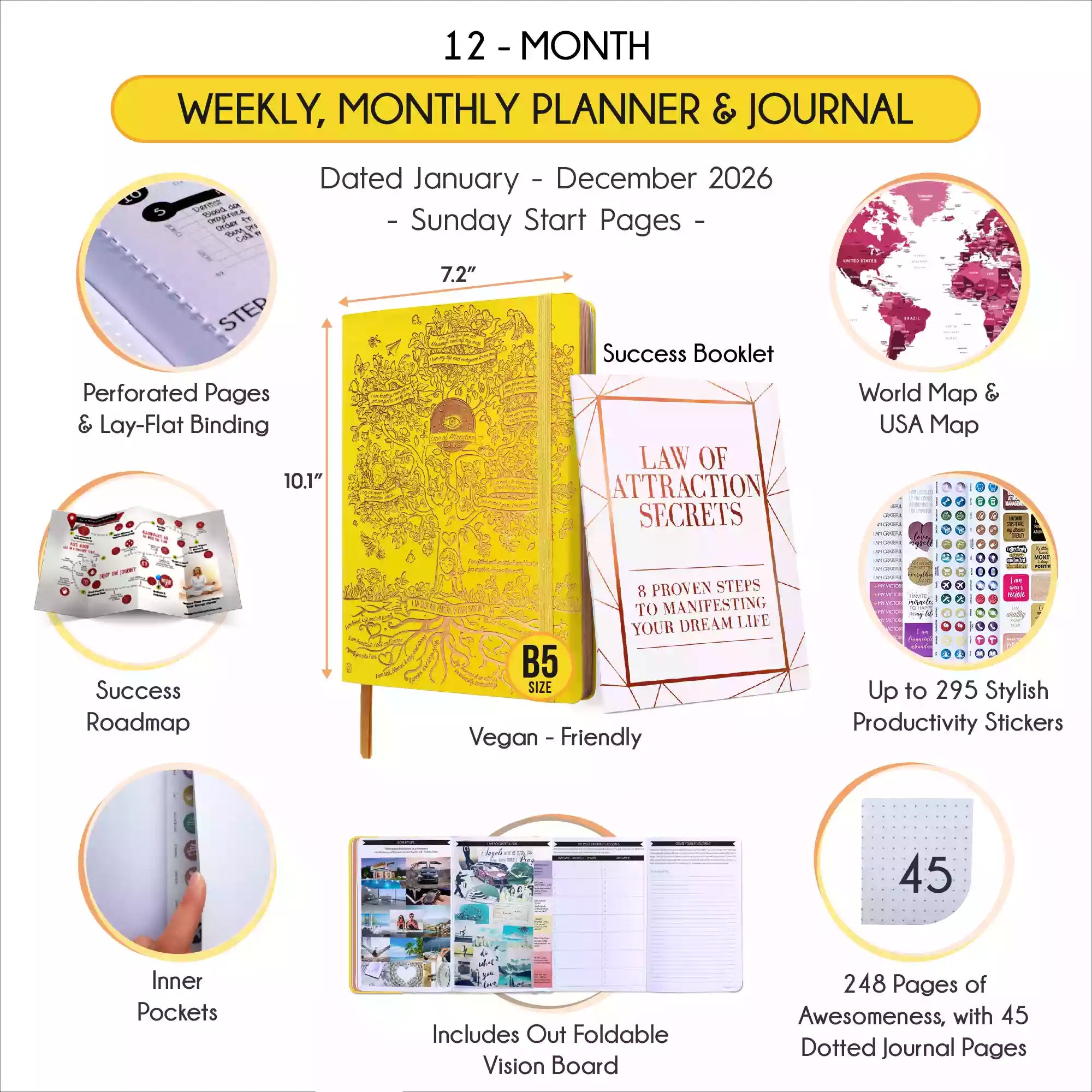 Jan - Dec 2026 Dated Deluxe LOA 12 Month Planner (B5 size: 7.5 x 10 inches) Yellow Tree