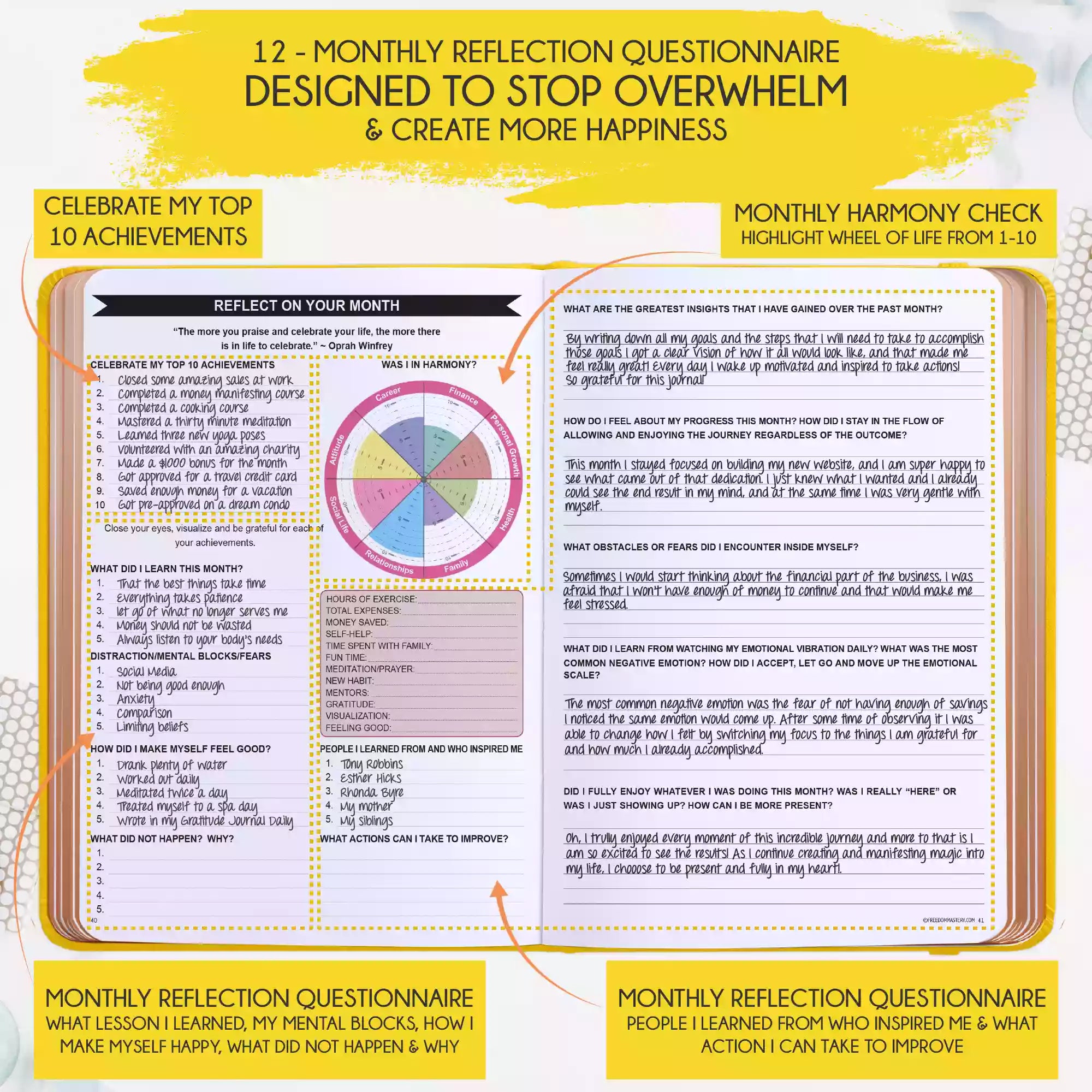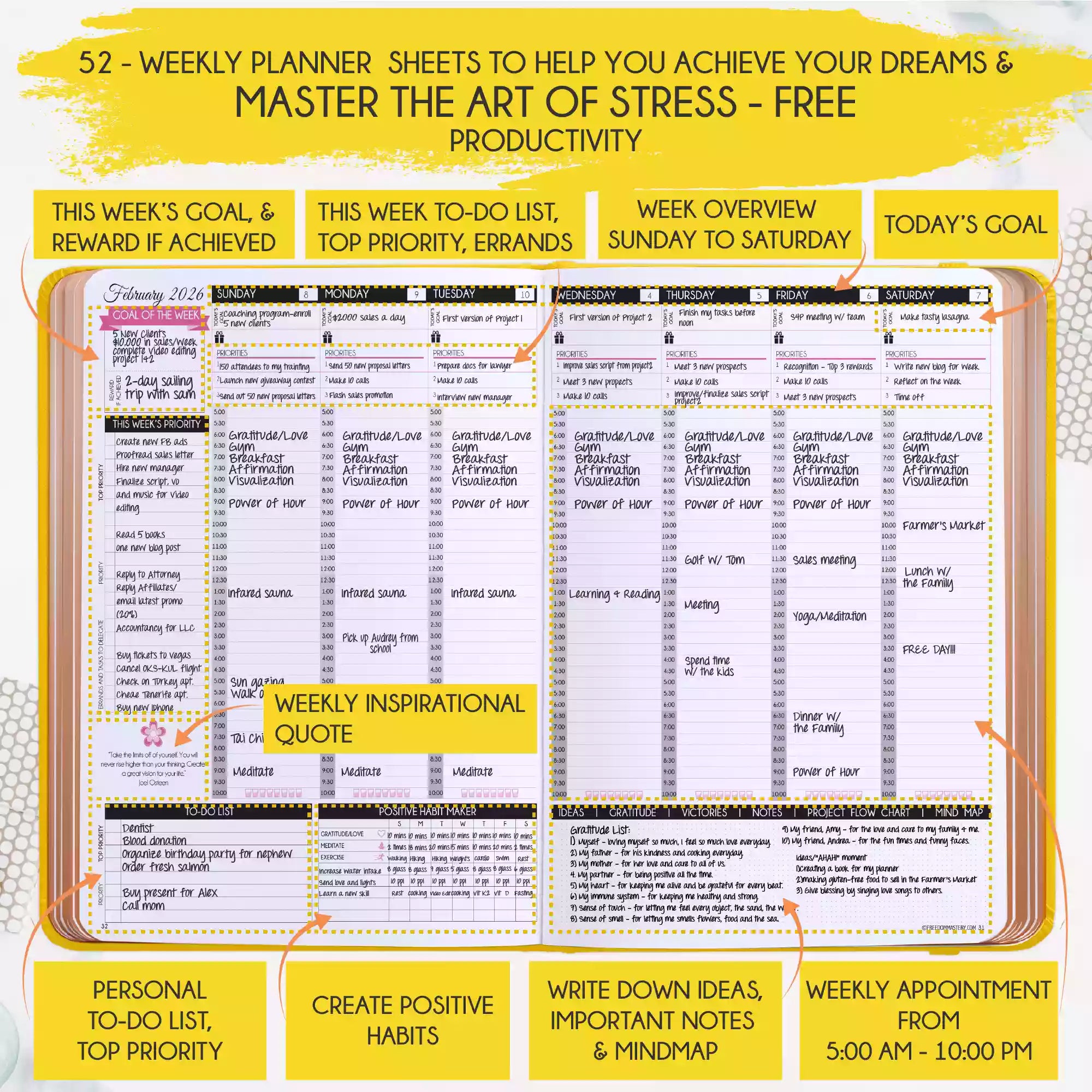 💎 INCREASE YOUR PRODUCTIVITY AND HAPPINESS BY 300% - Helps you become much more productive by teaching you how to focus only on your top priorities and delegating the rest. This helps you achieve more and create more free time and happiness for yourself. The perfect productivity and time management planner. This Weekly Planner includes To-Do Lists, Feel-Good List & Gratitude Journal - The weekly/monthly feel-good list will help you not to forget yourself and put yourself first.