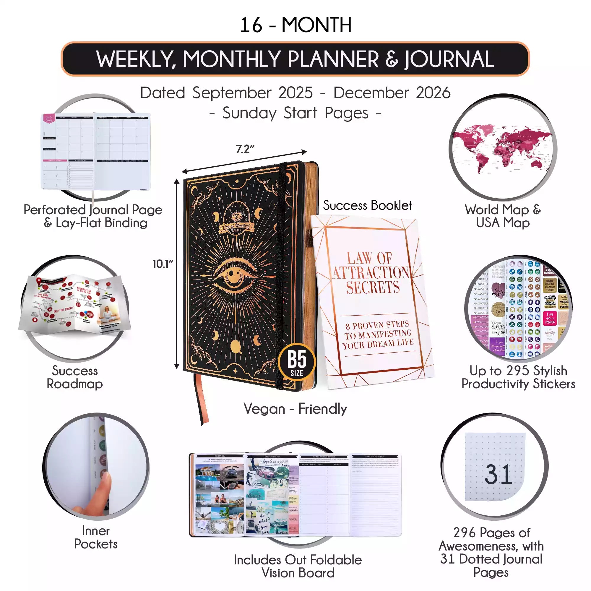 💎 Calendar starts Sep 2025 - Dec 2026 (Sunday start). B5 size: 7.5 x 10 inches.
