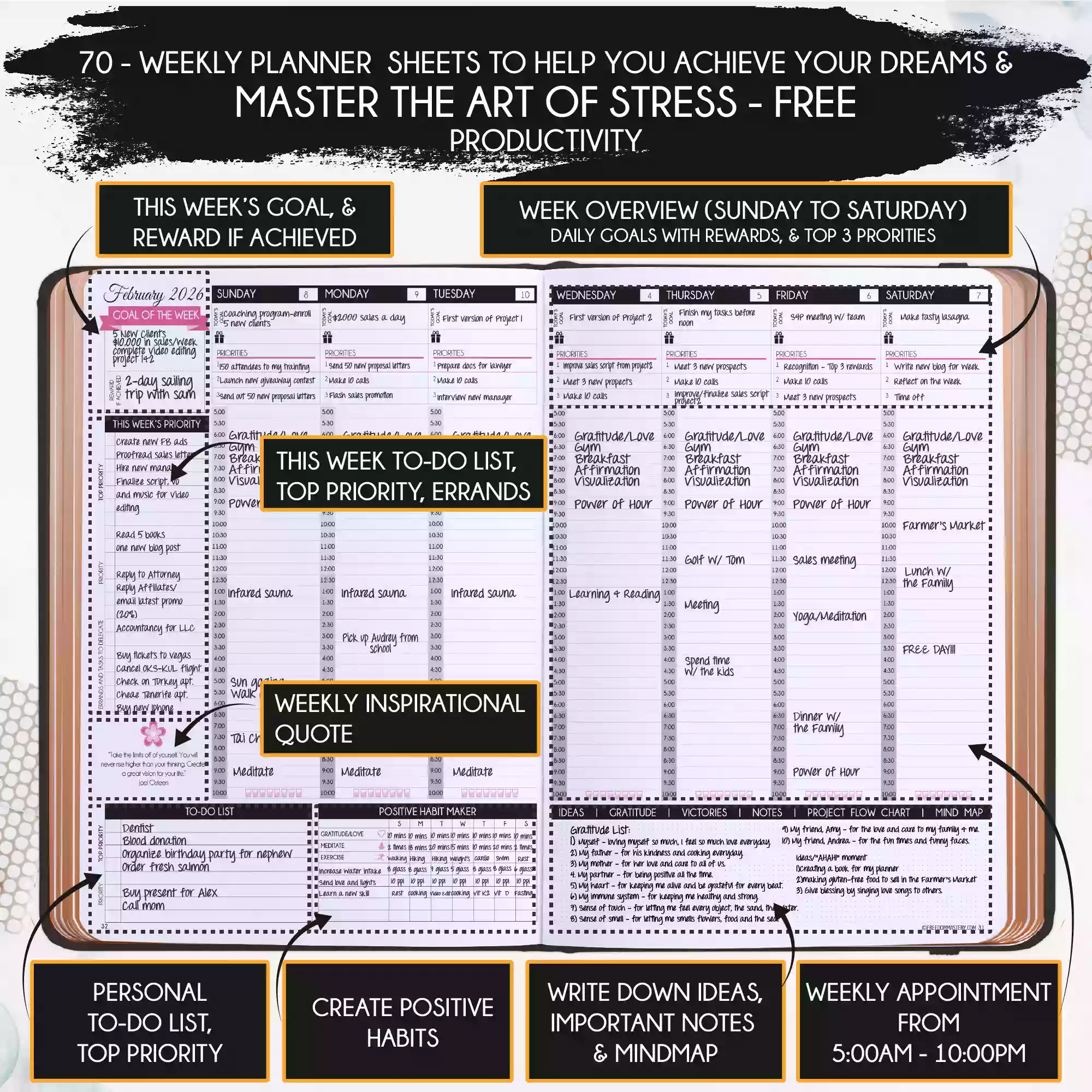 💎 CLASSIC + TOP QUALITY: Beautiful rose gold durable soft cover made from animal-friendly PU leather with artwork. Ideal for both women and men, perfect for entrepreneurs, professionals, college students and everyone who has burning desire to turn dreams into reality! FREE VIDEO MINI-COURSE: You will learn a 10-minute morning routine used by the most successful people to tenfold your productivity, focus, happiness, and passion! You will master setting goals and fix procrastination!