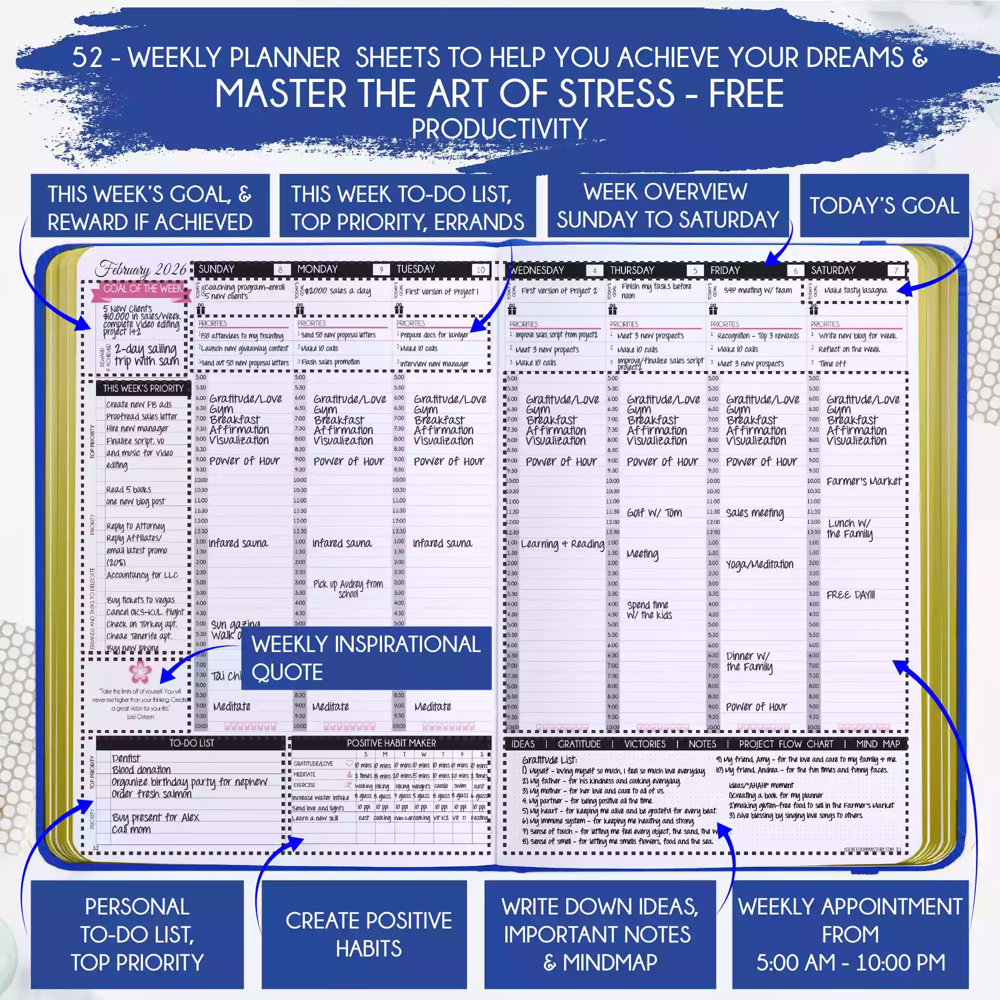 💎 CLASSIC + TOP QUALITY: Beautiful rose gold durable soft cover made from animal-friendly PU leather with artwork. Ideal for both women and men, perfect for entrepreneurs, professionals, college students and everyone who has burning desire to turn dreams into reality! FREE VIDEO MINI-COURSE: You will learn a 10-minute morning routine used by the most successful people to tenfold your productivity, focus, happiness, and passion! You will master setting goals and fix procrastination!