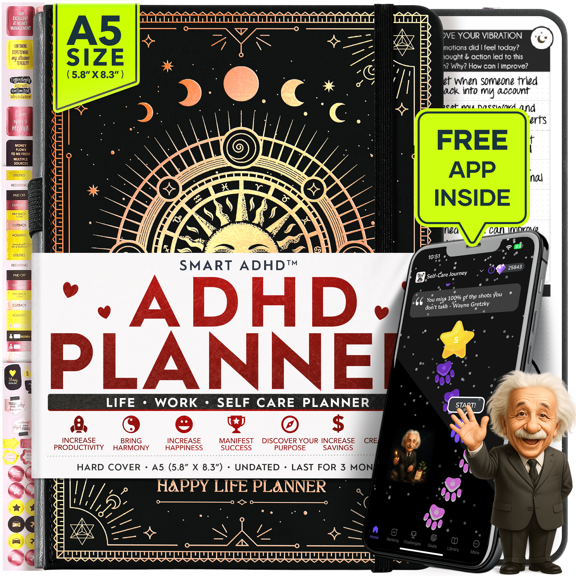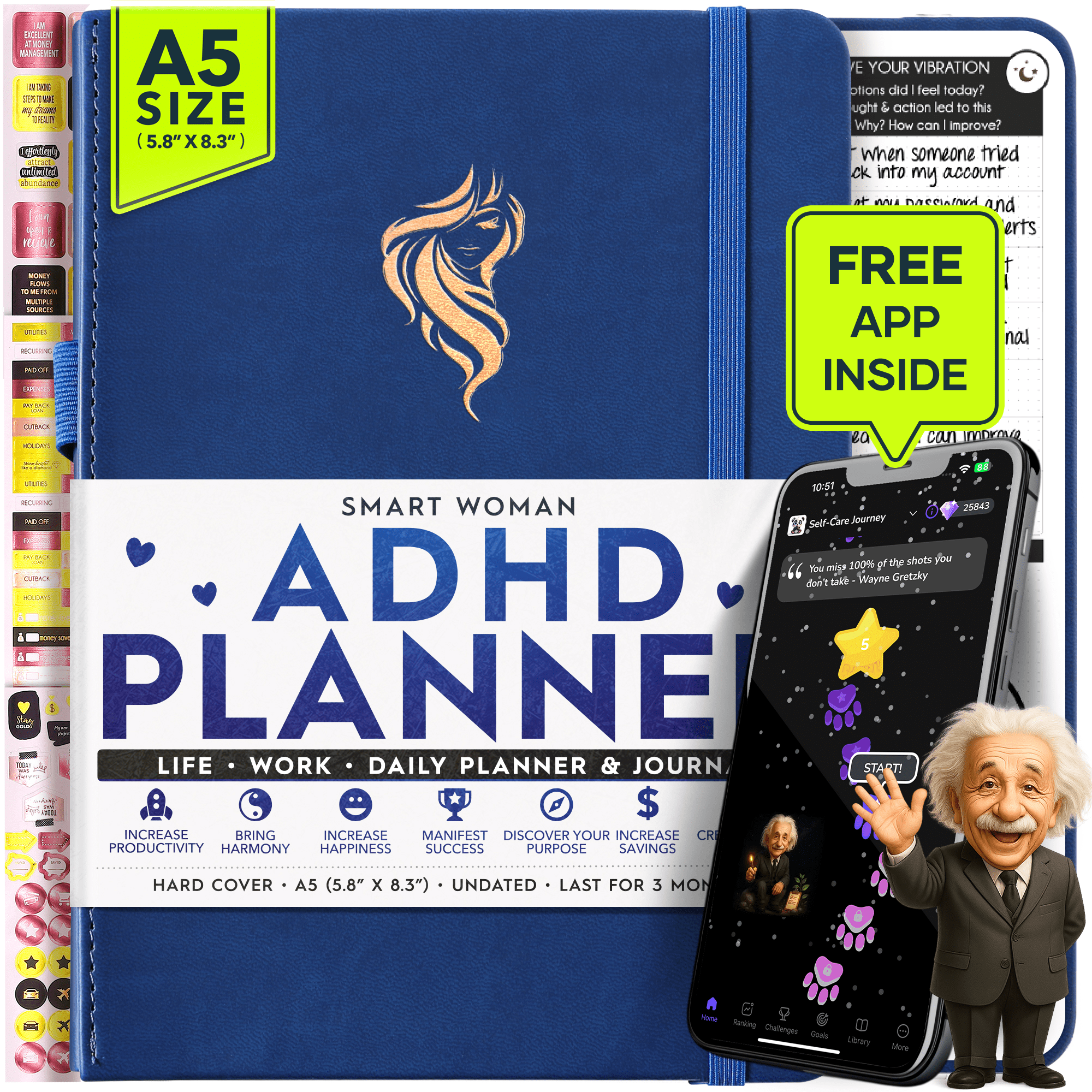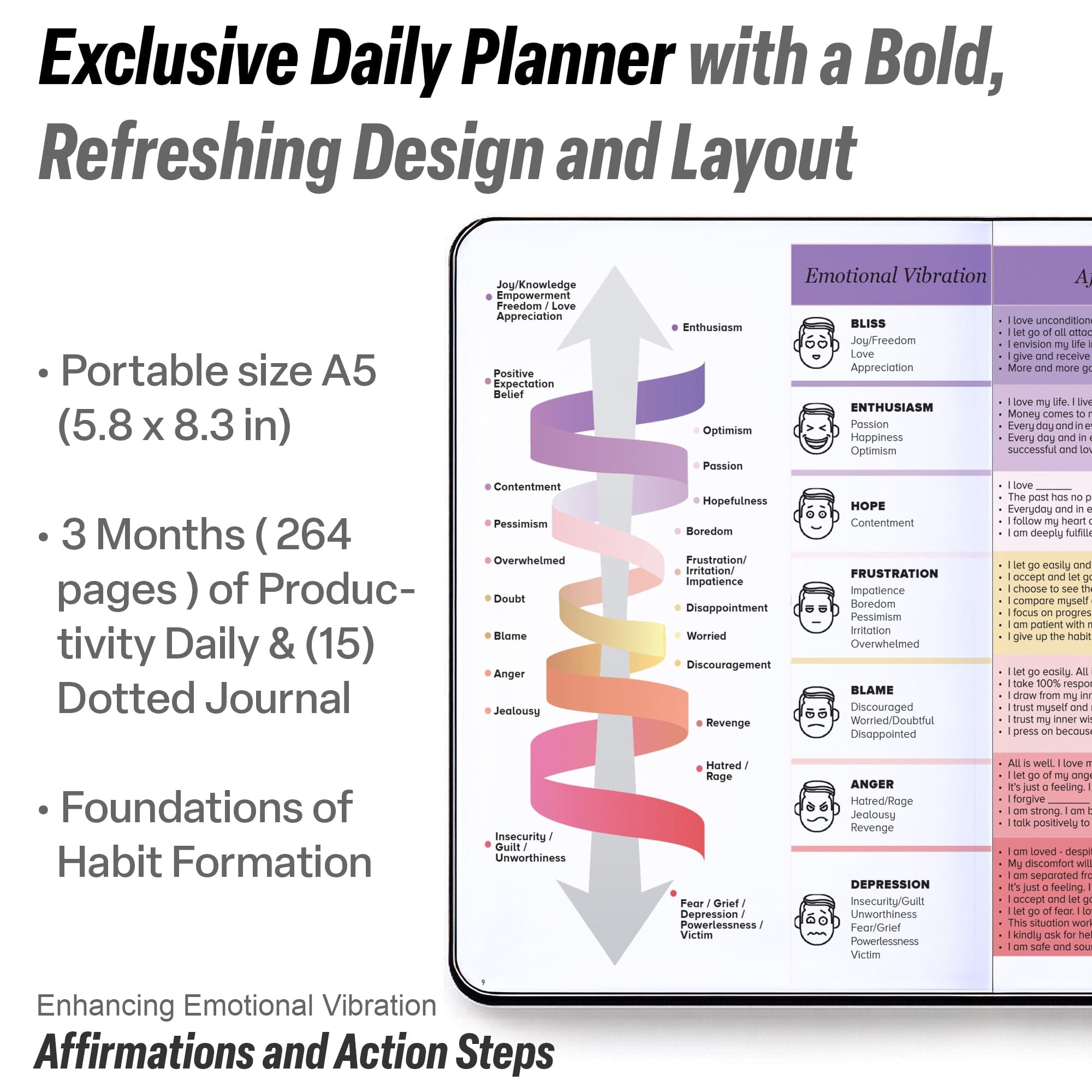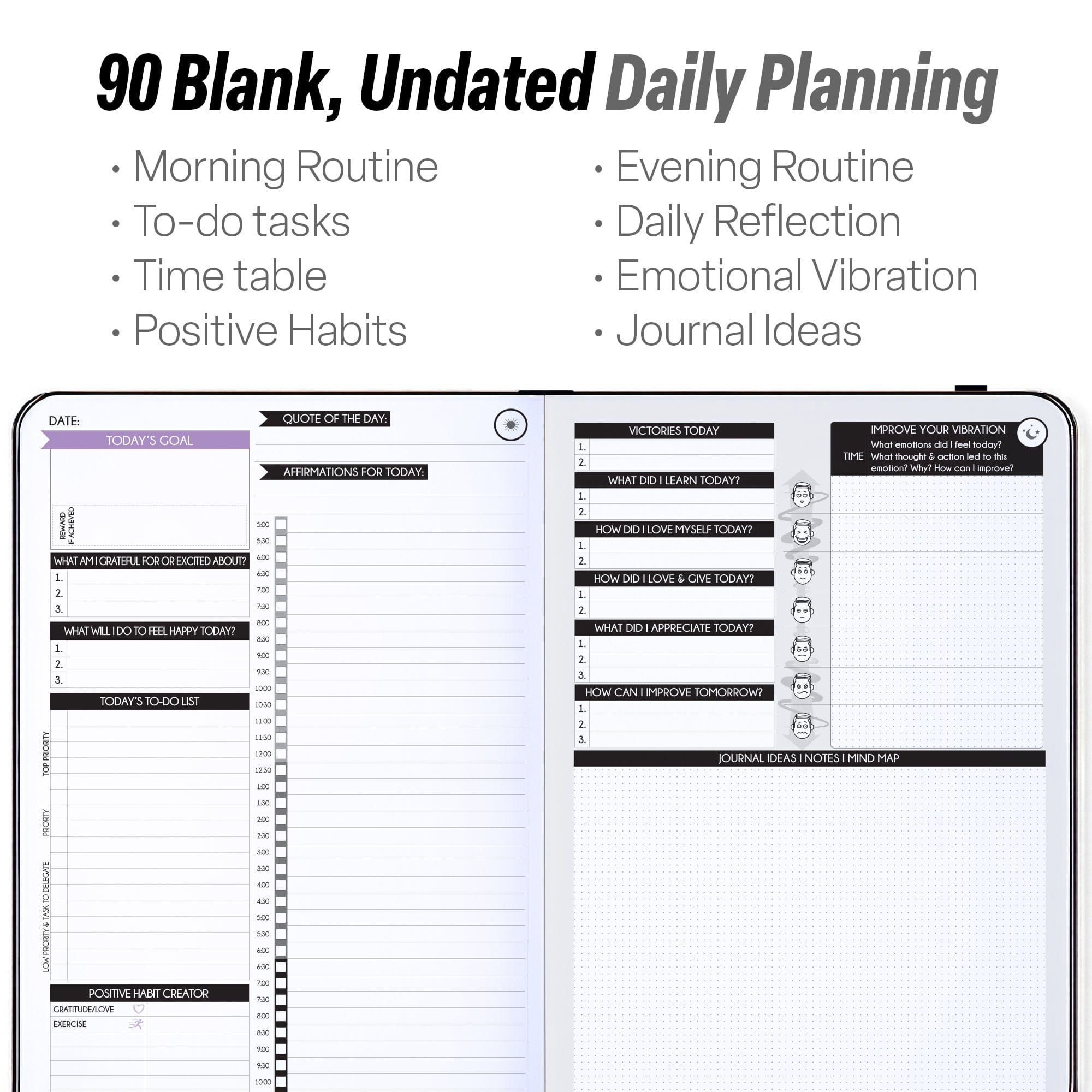 • 💎 THIS IS A DELUXE DAILY PLANNER showing you how to become the best possible version of yourself on a mental, physical & interpersonal level. It's the only diary of its kind, and its design is based on leading scientific studies that are proven to increase productivity & happiness! It has an out foldable vision board to stay focused, morning & evening power questions, mind maps, reflection pages, habit trackers, back pocket, gratitude journal and so much more than any other planner listed!