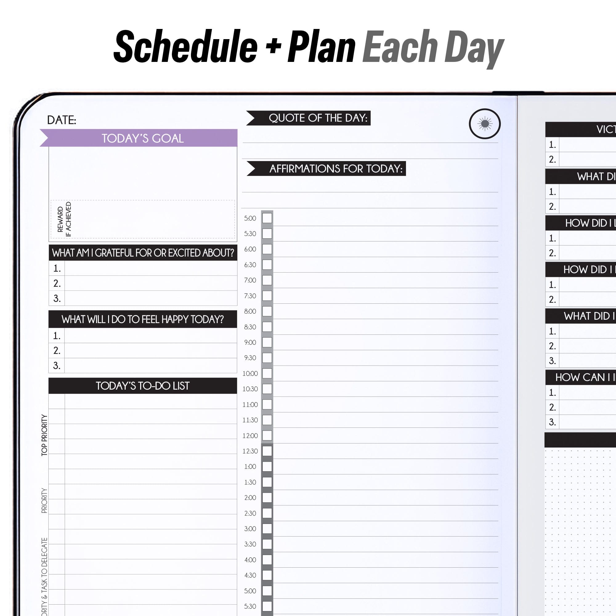 • 💎 INCREASE YOUR PRODUCTIVITY AND HAPPINESS BY 300% - Help you become much more productive by teaching you how to focus only on your top priorities and delegate the rest. So you can achieve more and create more free time, happiness for yourself. The perfect daily productivity and time management planner. This day planner include To-Do Lists, Feel-Good List & Gratitude Journal - The weekly/monthly feel-good list will help you not to forget yourself and put yourself first.