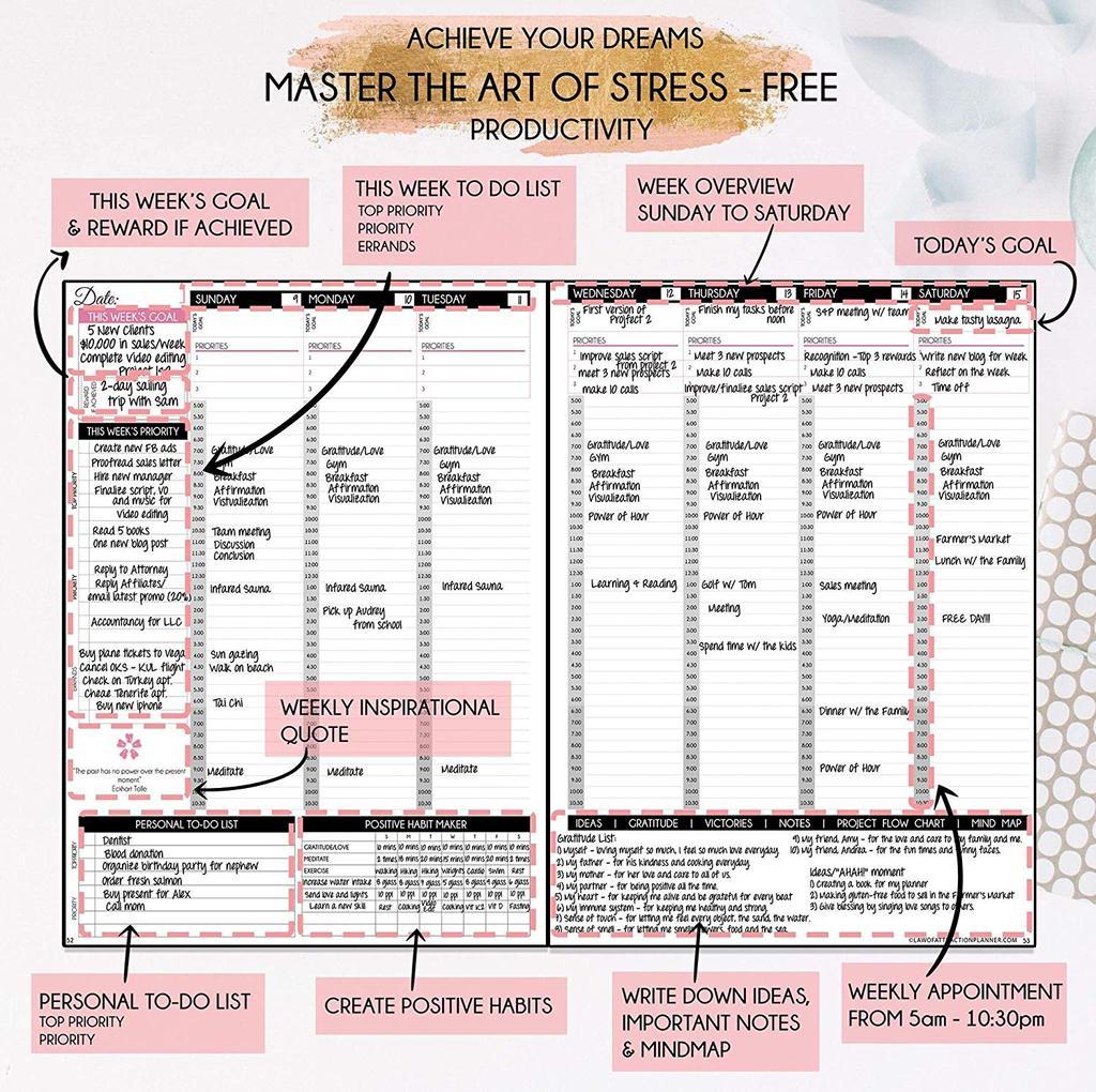 Helps you become much more productive by teaching you how to focus only on your top priorities and delegating the rest. This helps you achieve more and create more free time and happiness for yourself. The perfect productivity and time management planner for 2020. This Weekly Planner includes To-Do Lists, Feel-Good List & Gratitude Journal - The weekly/monthly feel-good list will help you not to forget yourself and put yourself first.