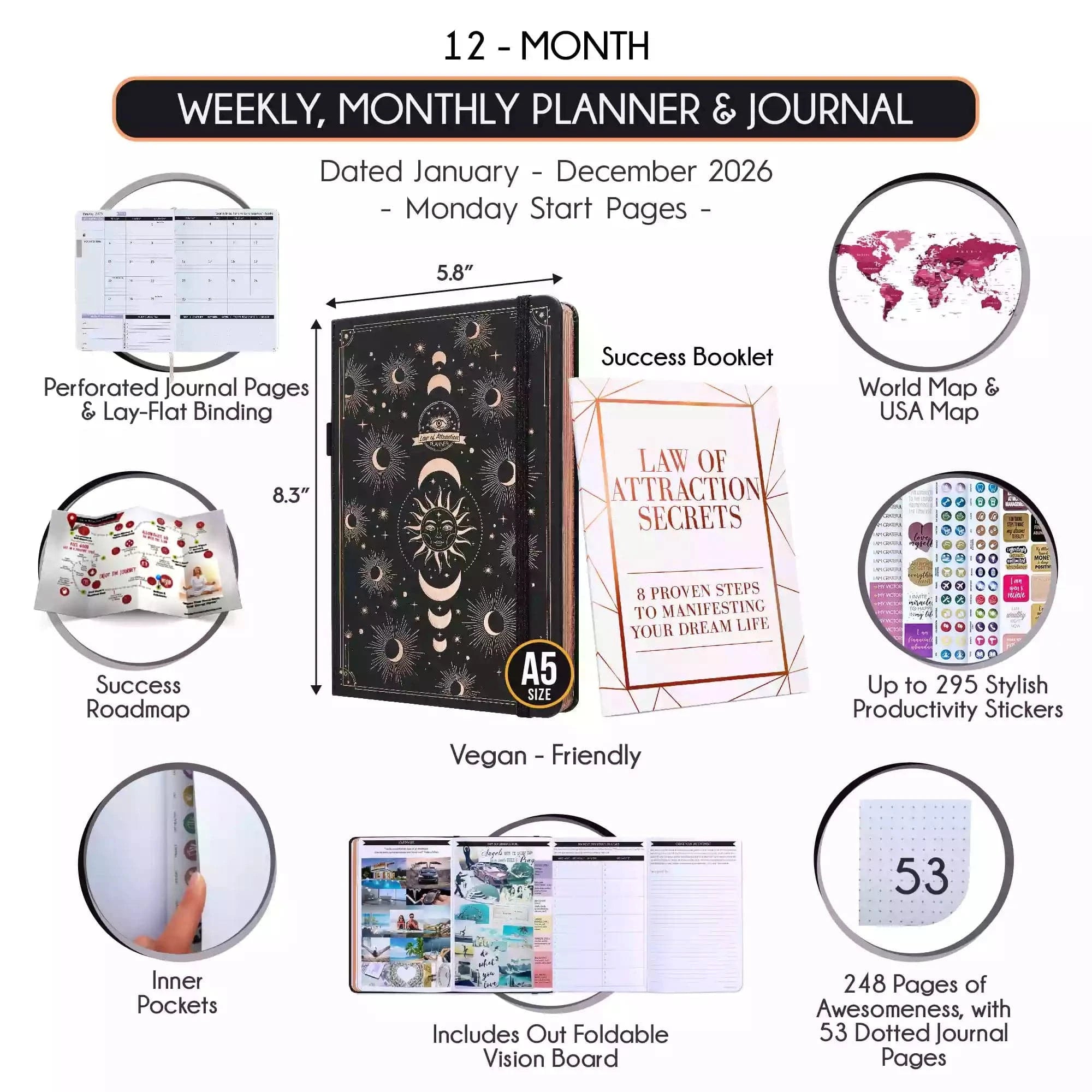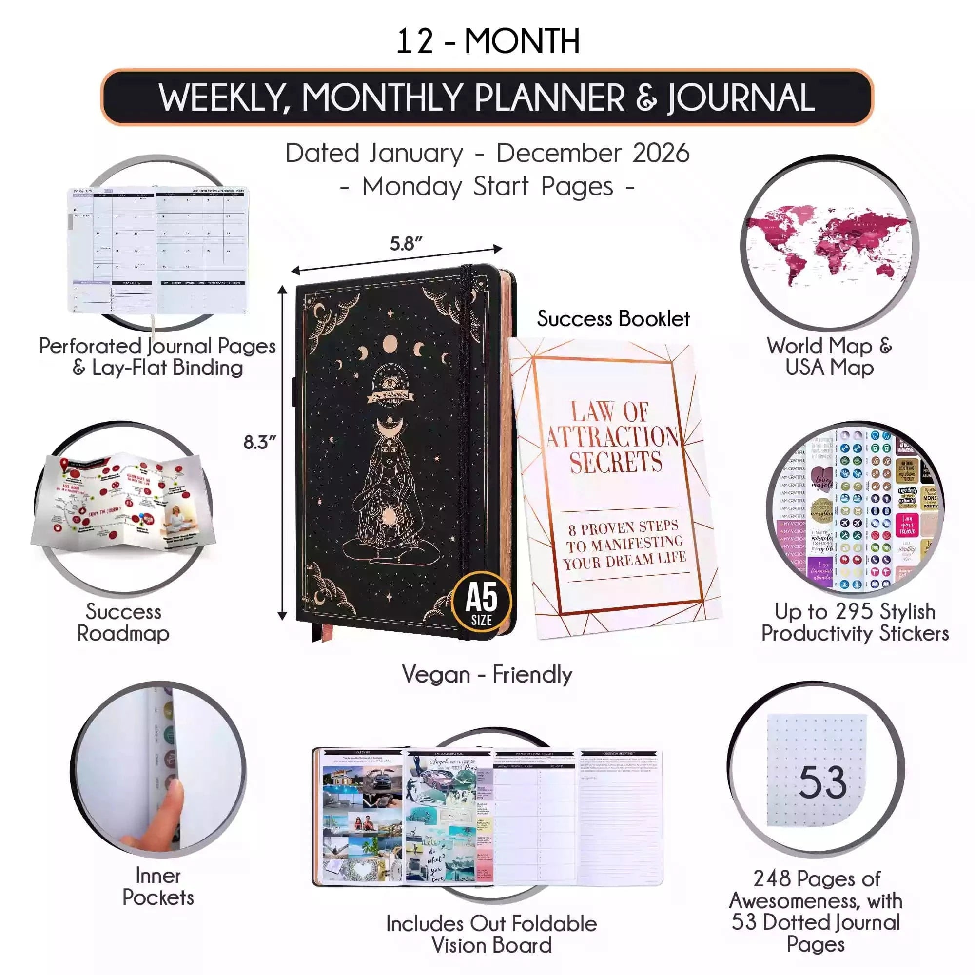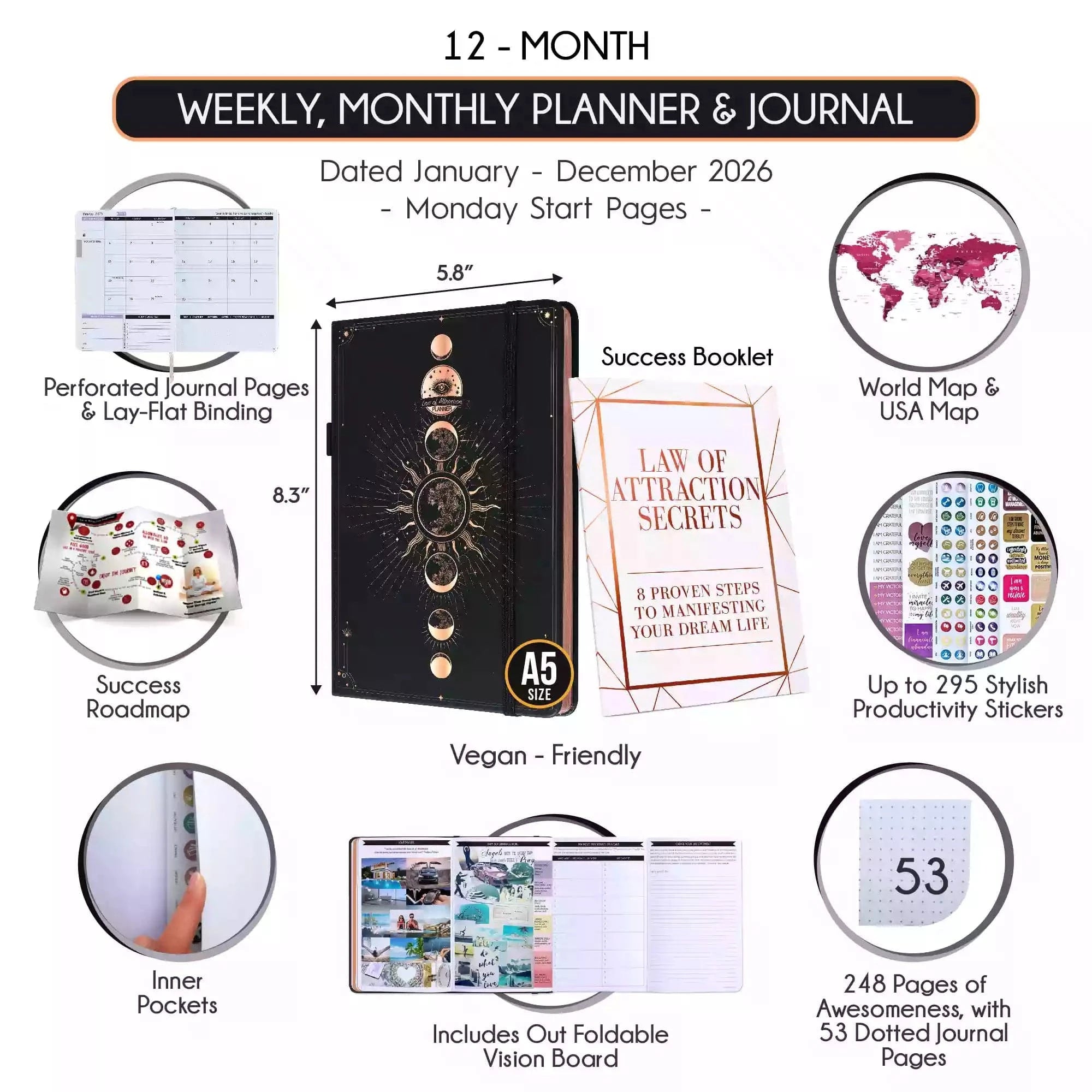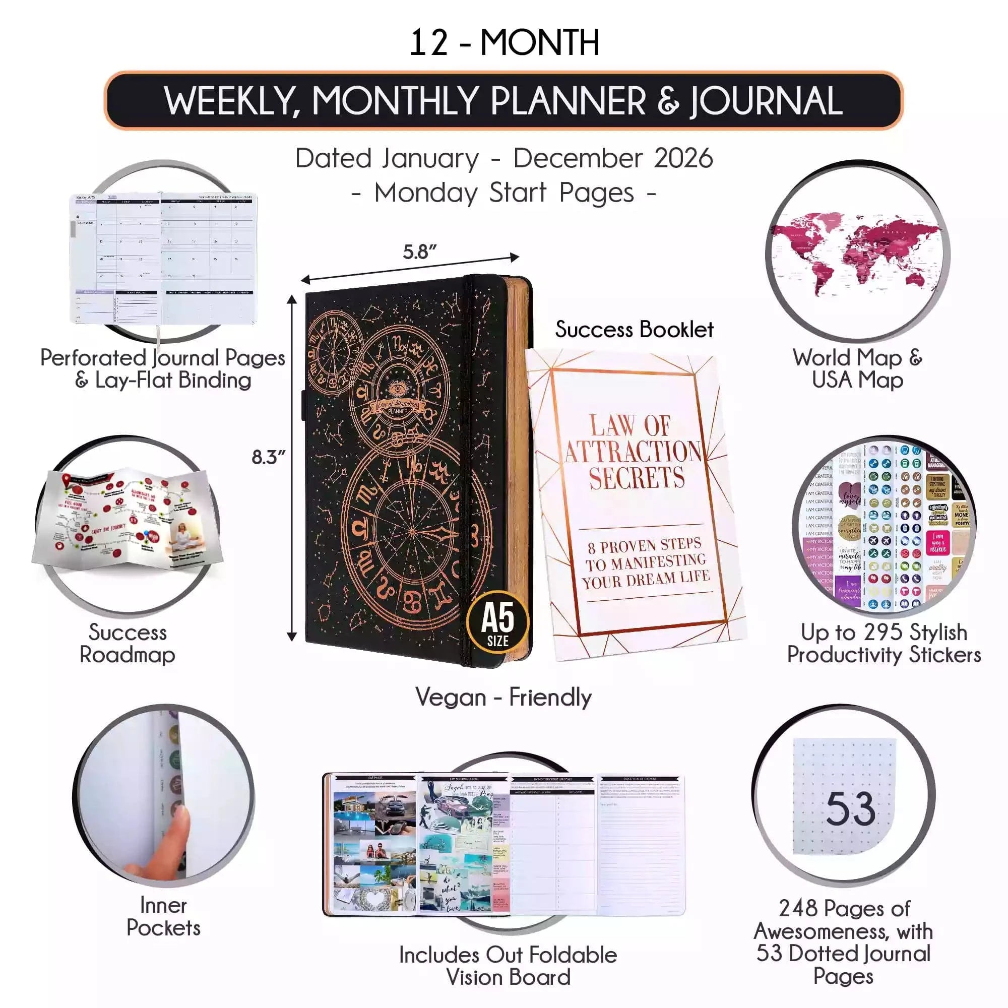 PRE-ORDER: Jan - Dec 2026 Dated Monday Start Deluxe LOA 12 Month Planner (A5 Size: 6 x 8.5 inches) Black Covers