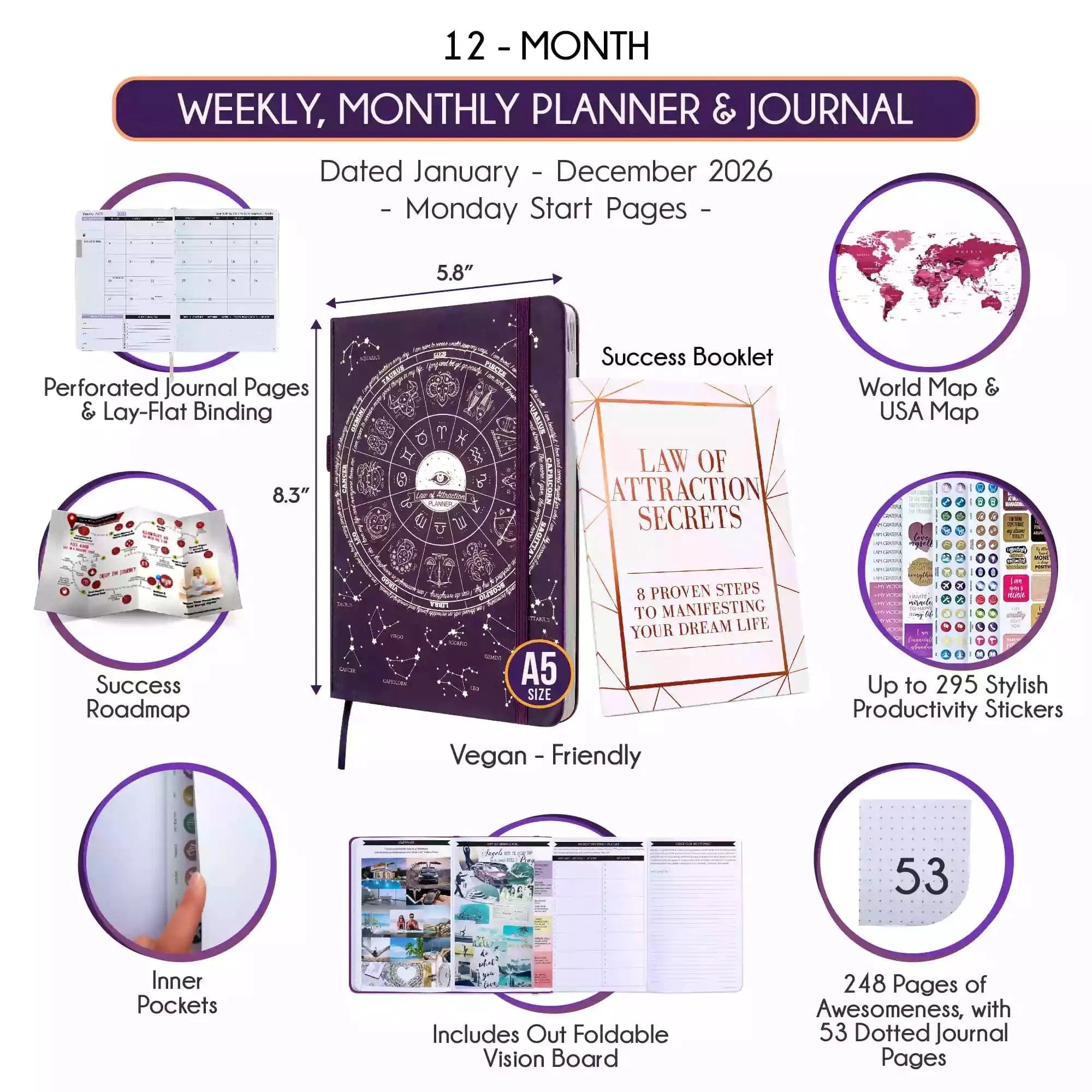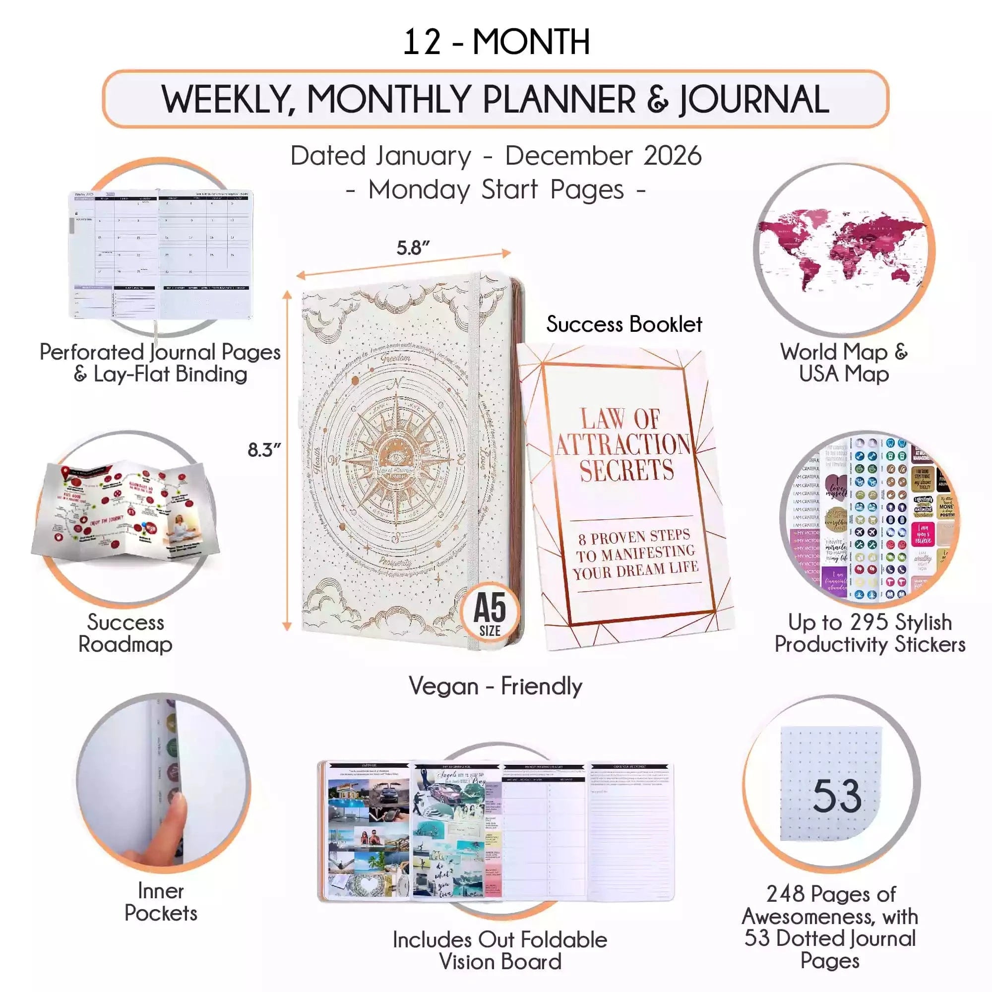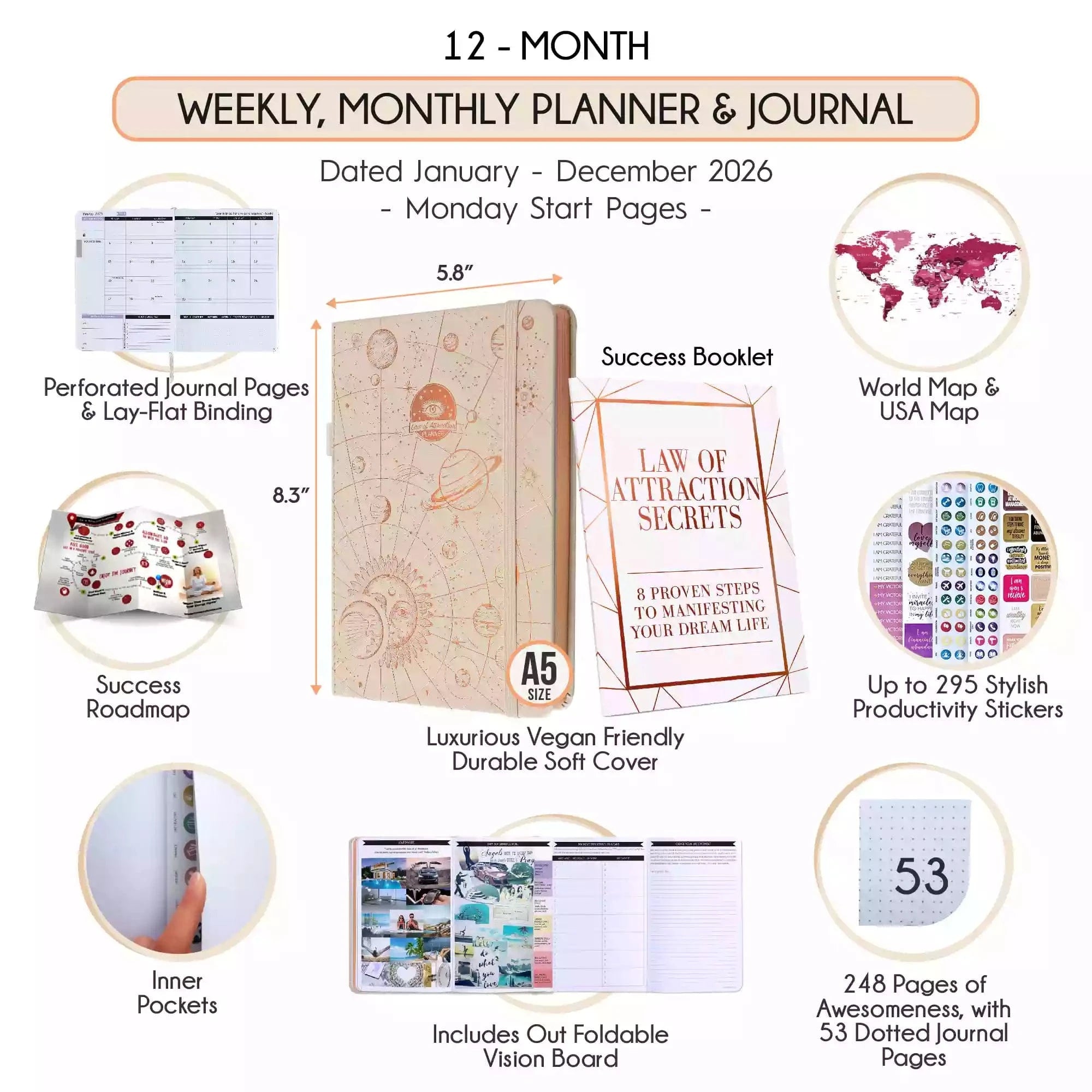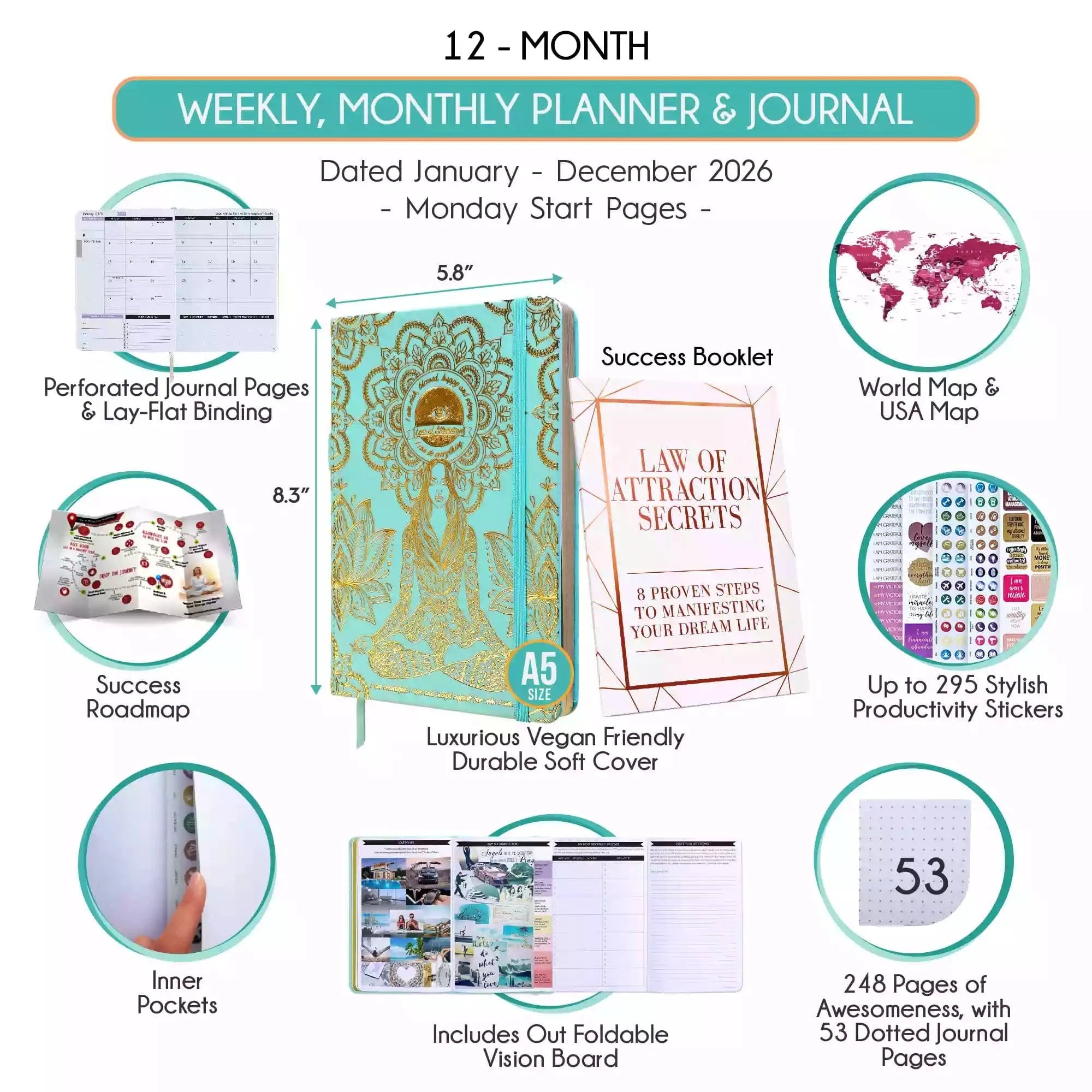 💎 Calendar starts Jan - Dec 2026. Monday start horizontal layout weekly pages. A5 size: 6 x 8.5 inches.