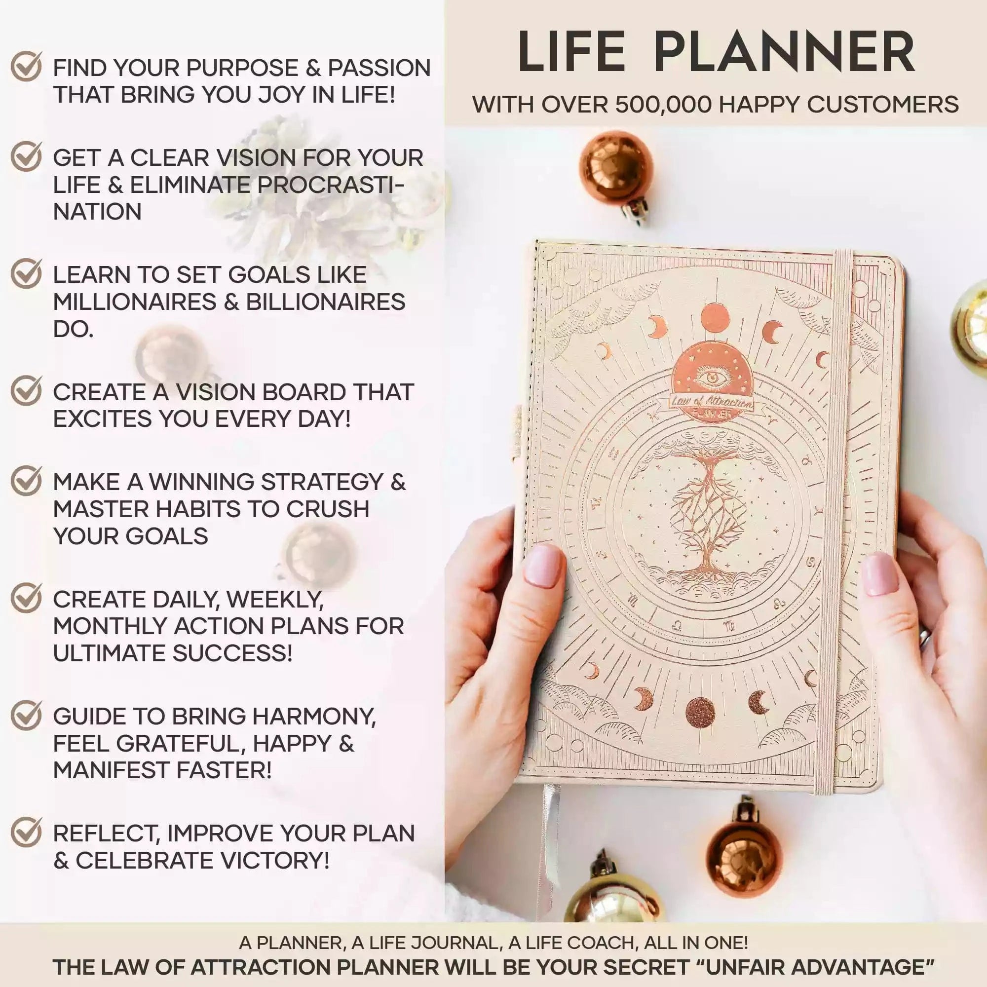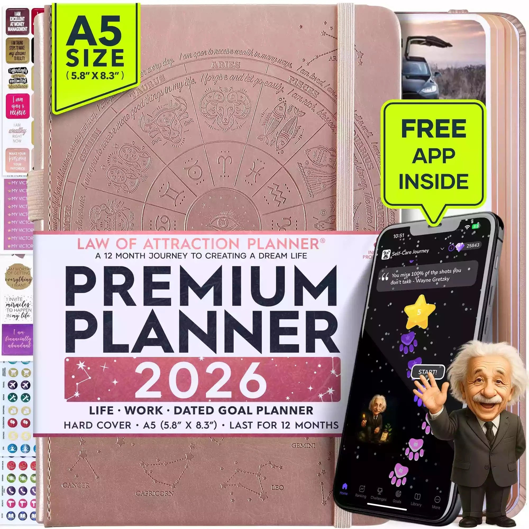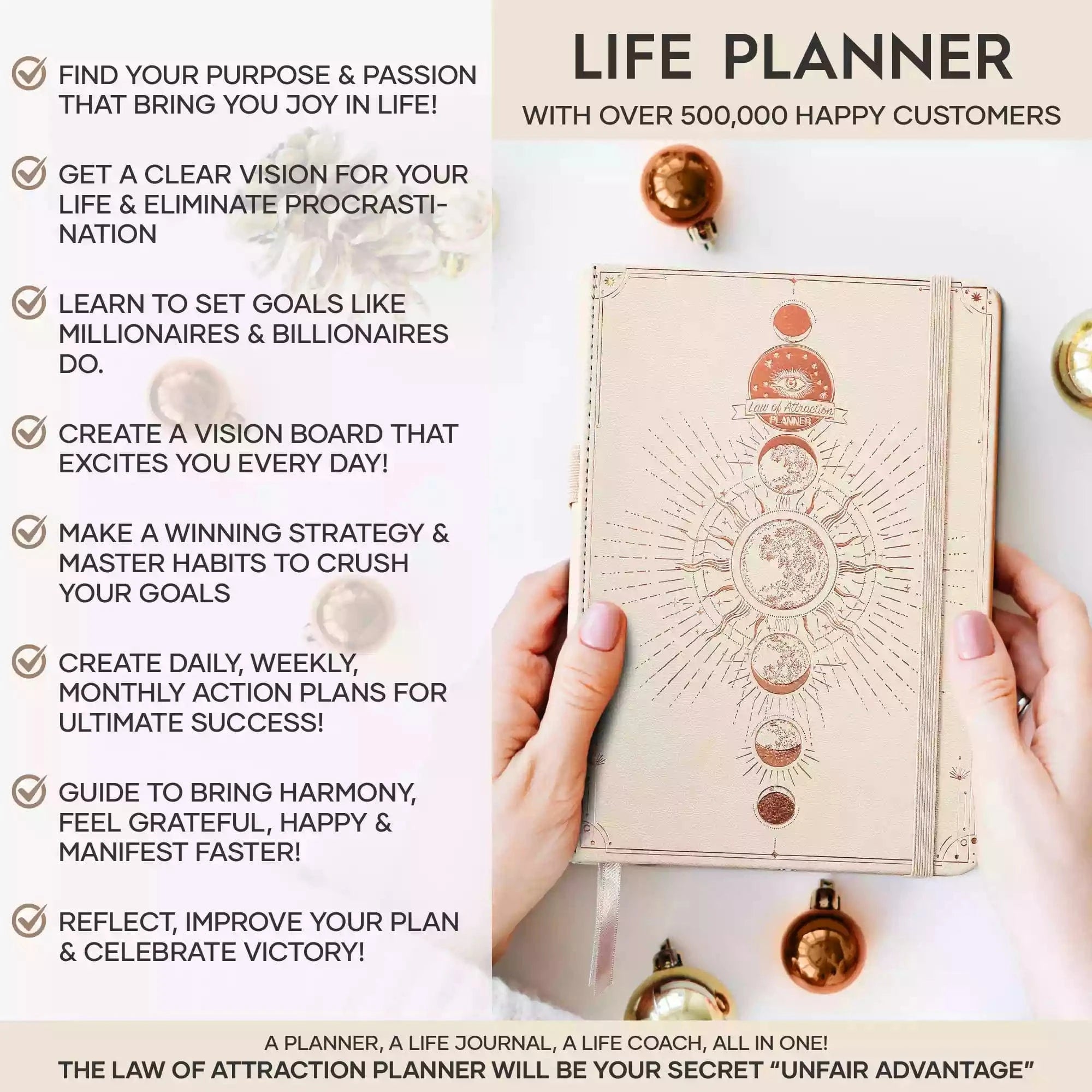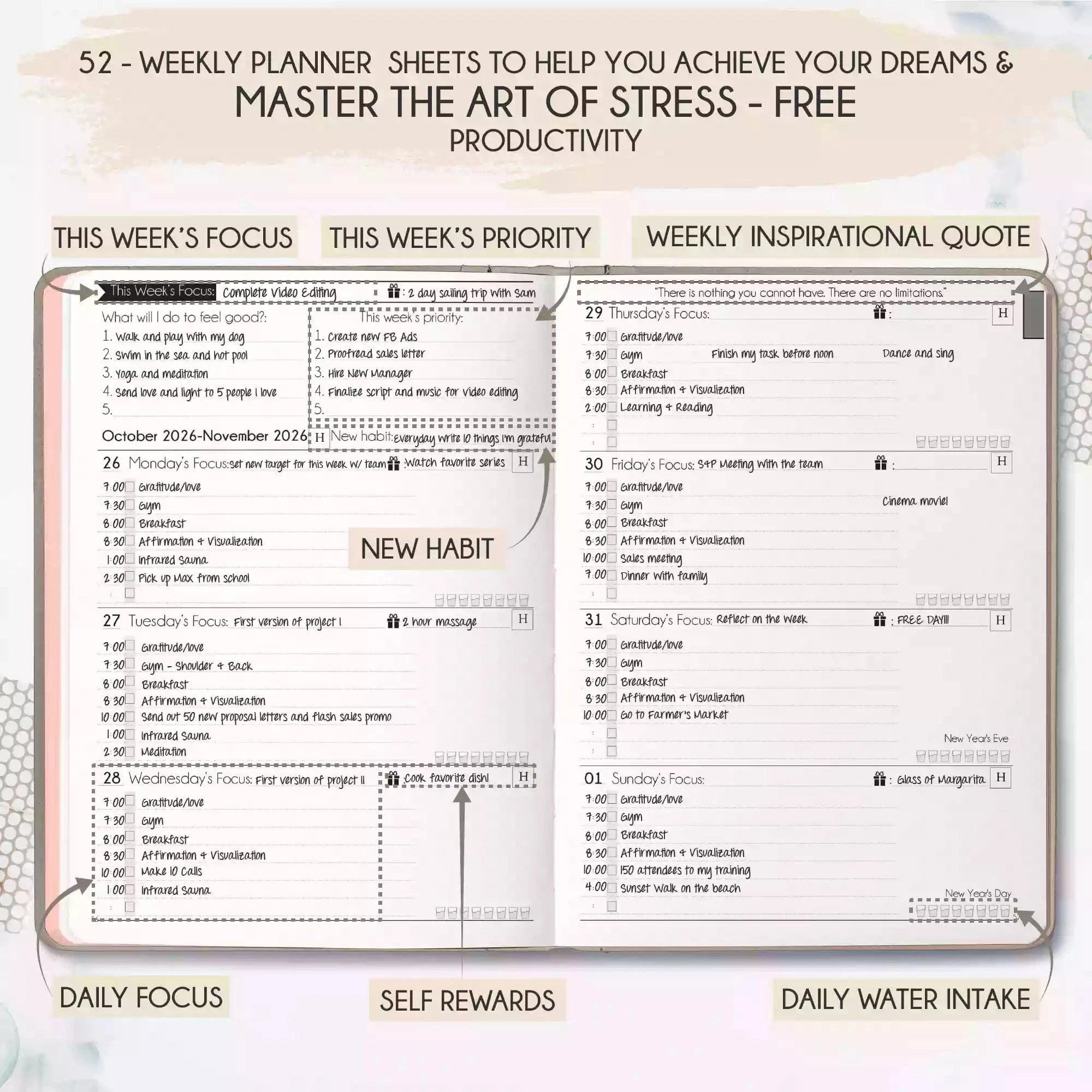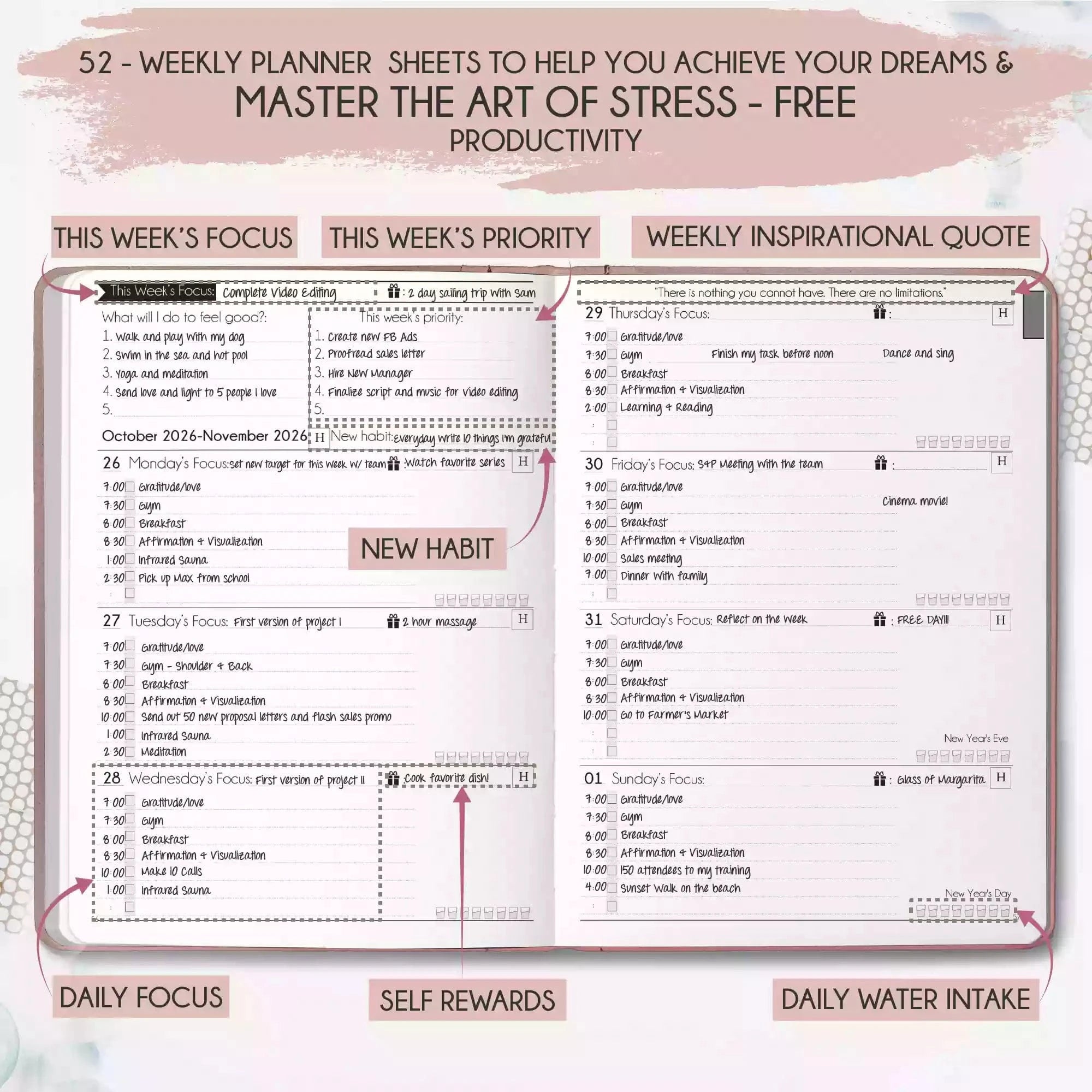 💎 CLASSIC + TOP QUALITY: Beautiful rose gold durable soft cover made from animal-friendly PU leather with artwork. Ideal for both women and men, perfect for entrepreneurs, professionals, college students and everyone who has burning desire to turn dreams into reality! FREE VIDEO MINI-COURSE: You will learn a 10-minute morning routine used by the most successful people to tenfold your productivity, focus, happiness, and passion! You will master setting goals and fix procrastination!