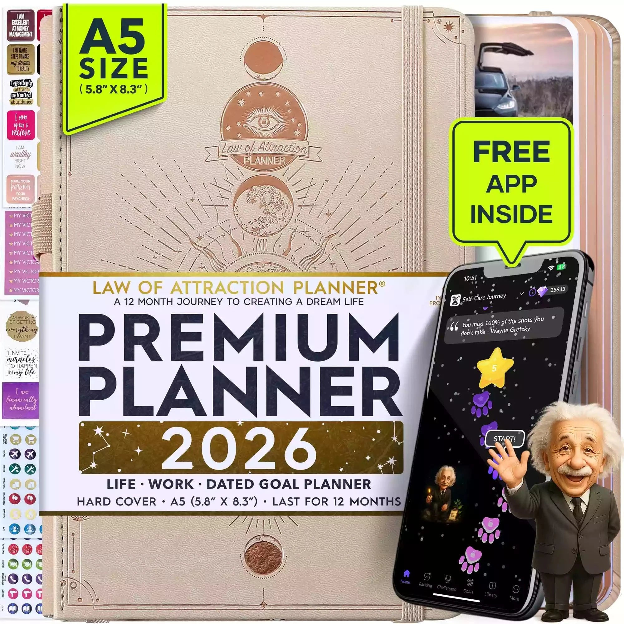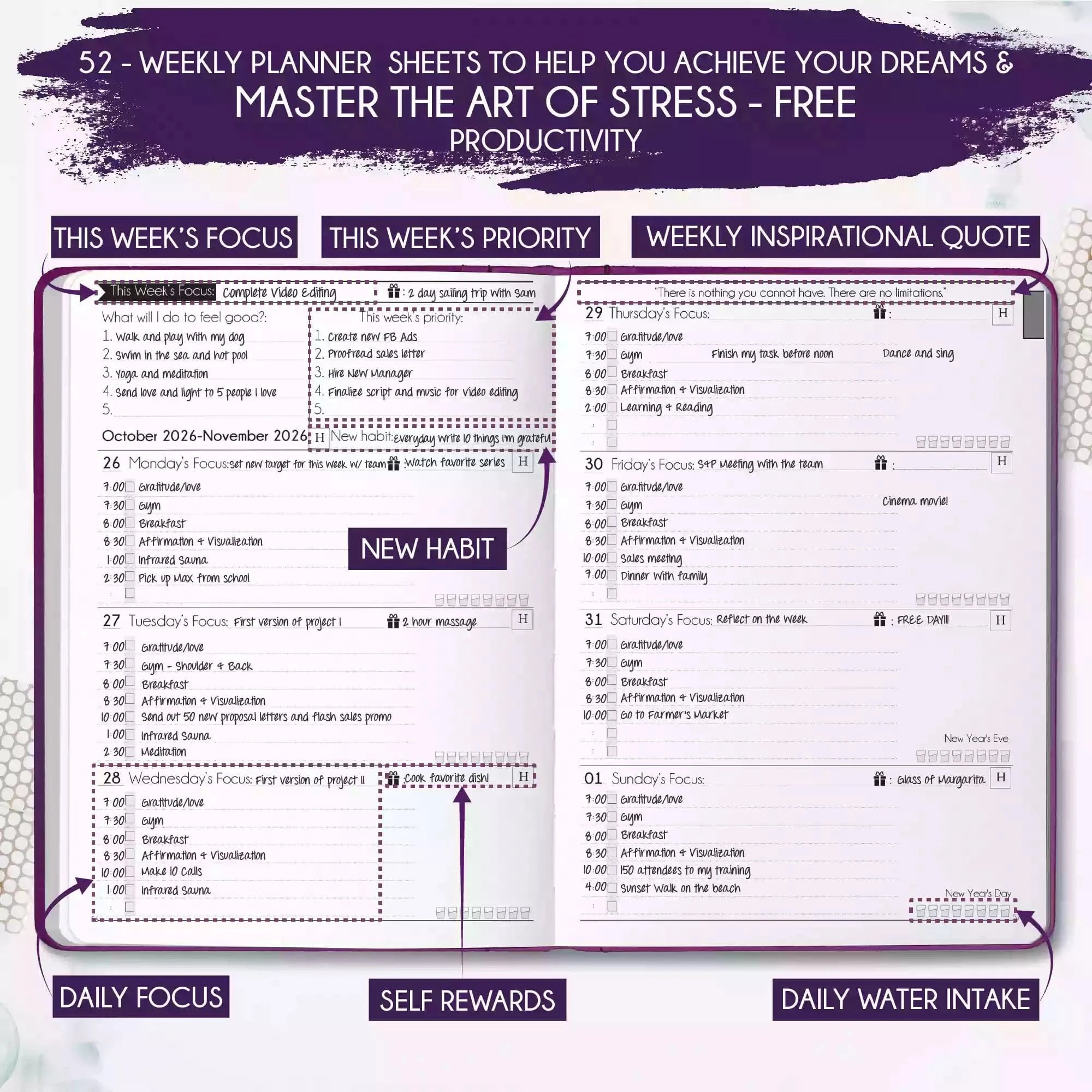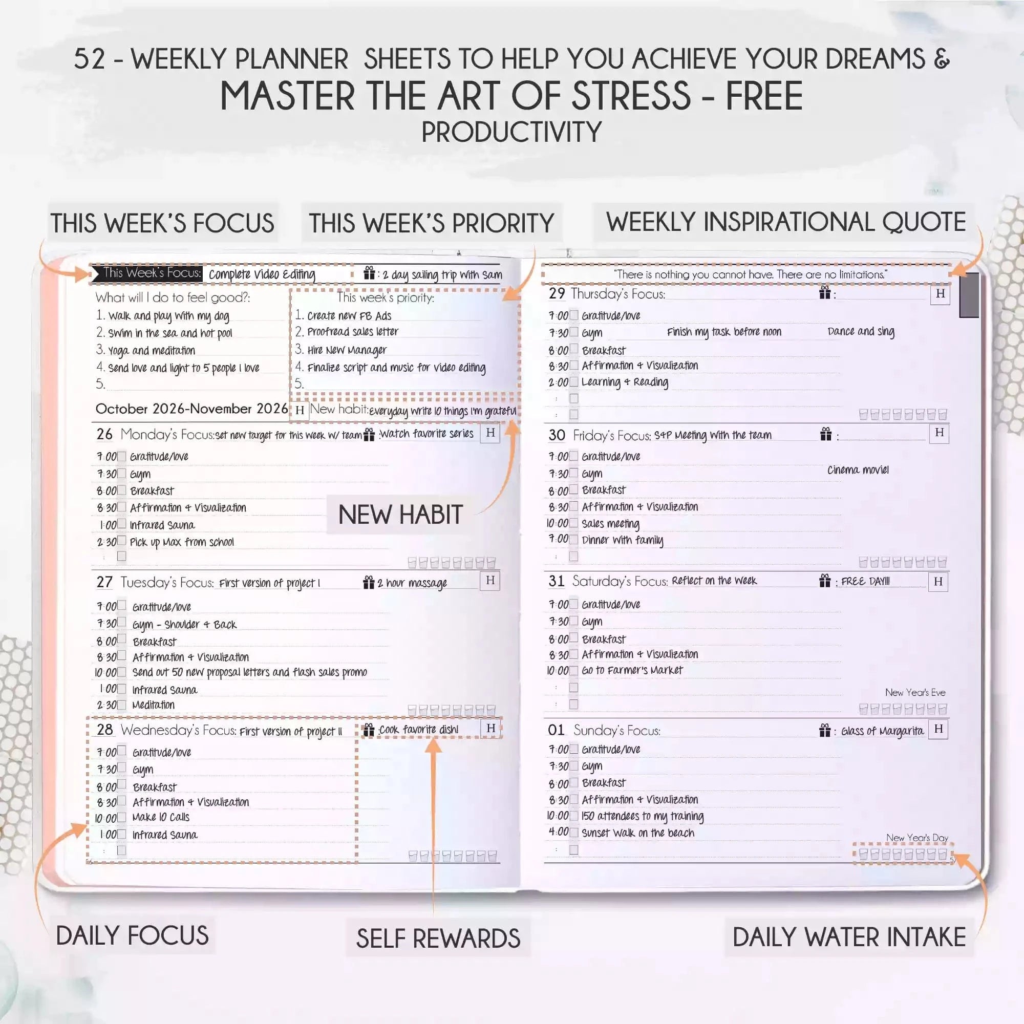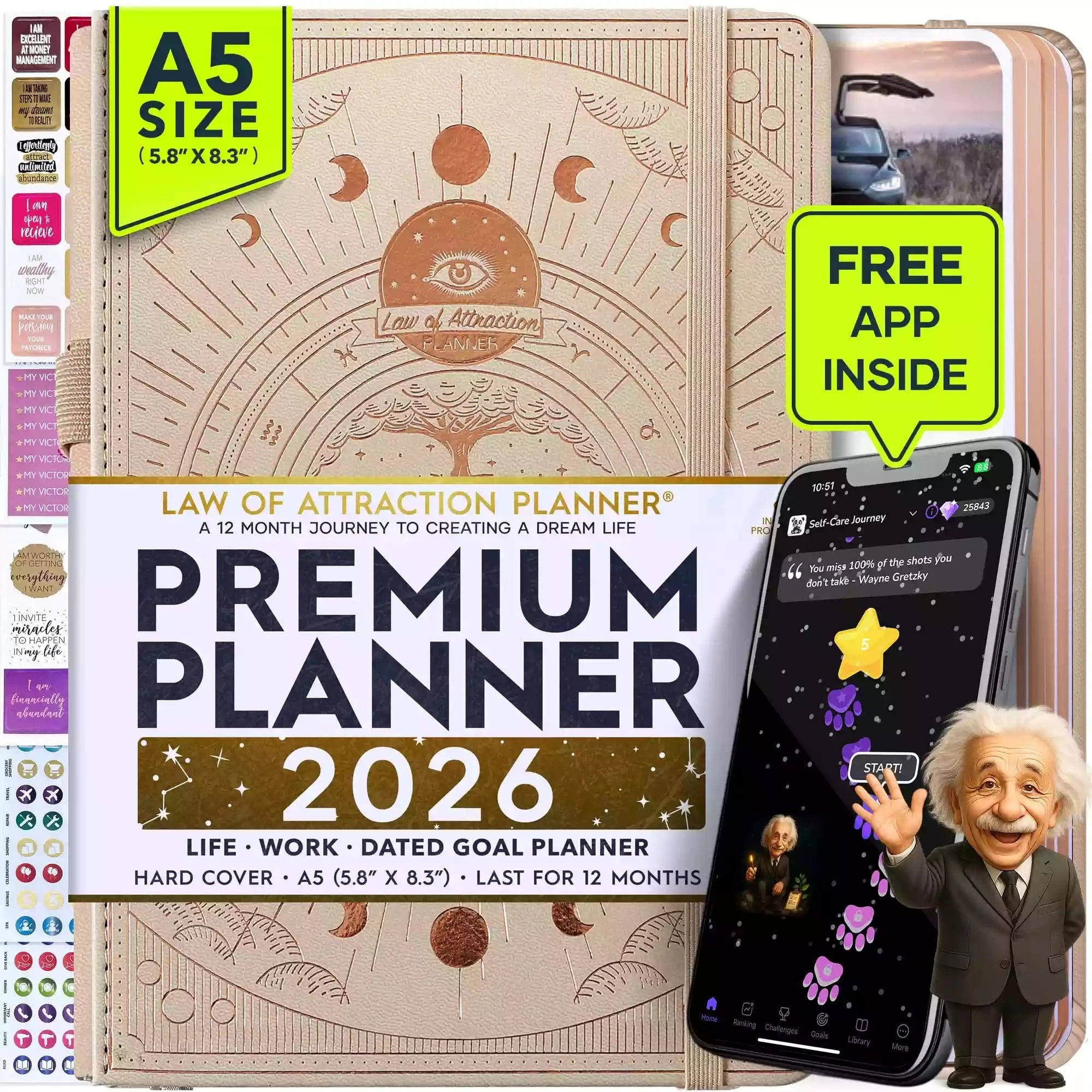 💎 CLASSIC + TOP QUALITY: Beautiful rose gold durable soft cover made from animal-friendly PU leather with artwork. Ideal for both women and men, perfect for entrepreneurs, professionals, college students and everyone who has burning desire to turn dreams into reality! FREE VIDEO MINI-COURSE: You will learn a 10-minute morning routine used by the most successful people to tenfold your productivity, focus, happiness, and passion! You will master setting goals and fix procrastination!