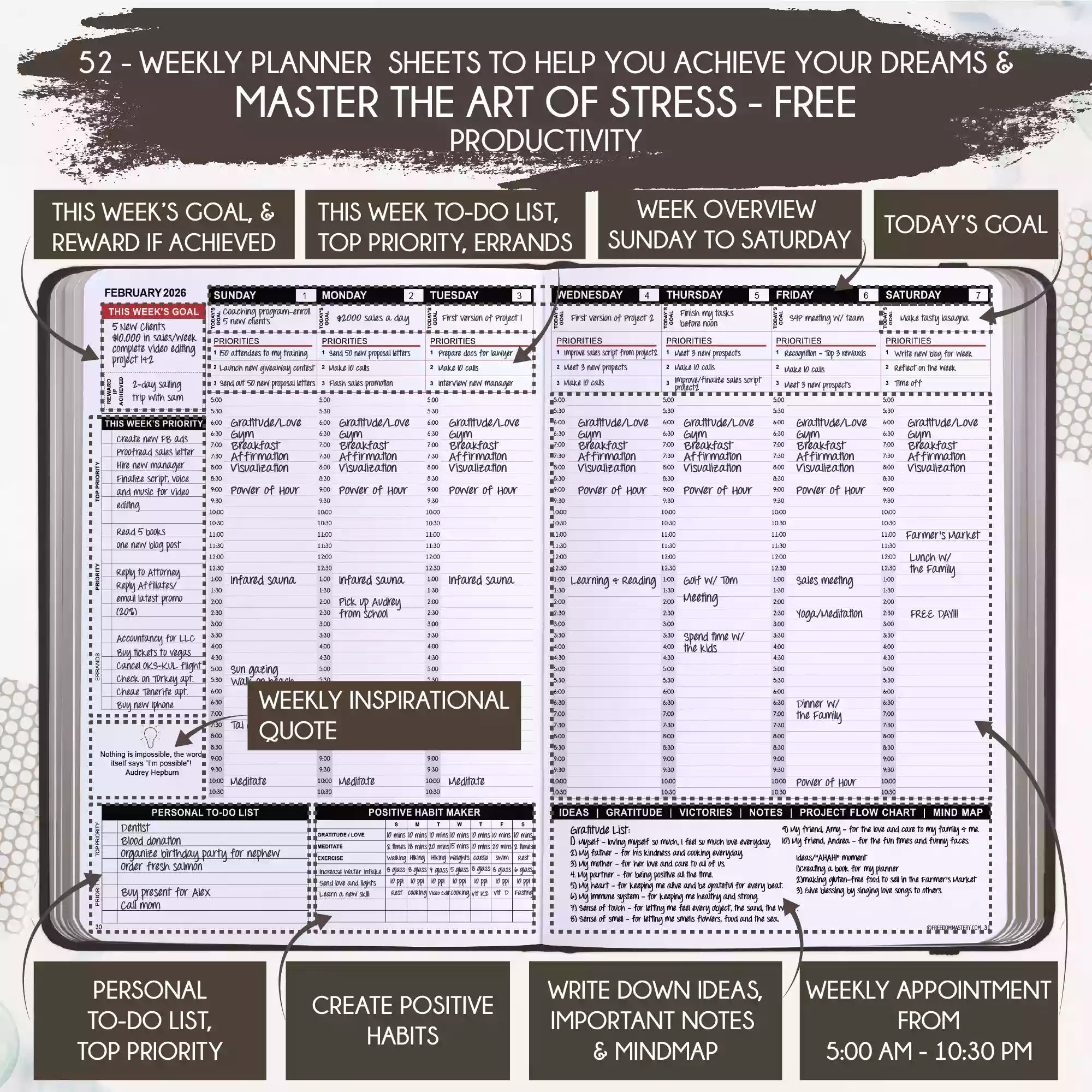 💎 CLASSIC + TOP QUALITY: Beautiful rose gold durable soft cover made from animal-friendly PU leather with artwork. Ideal for both women and men, perfect for entrepreneurs, professionals, college students and everyone who has burning desire to turn dreams into reality! FREE VIDEO MINI-COURSE: You will learn a 10-minute morning routine used by the most successful people to tenfold your productivity, focus, happiness, and passion! You will master setting goals and fix procrastination!