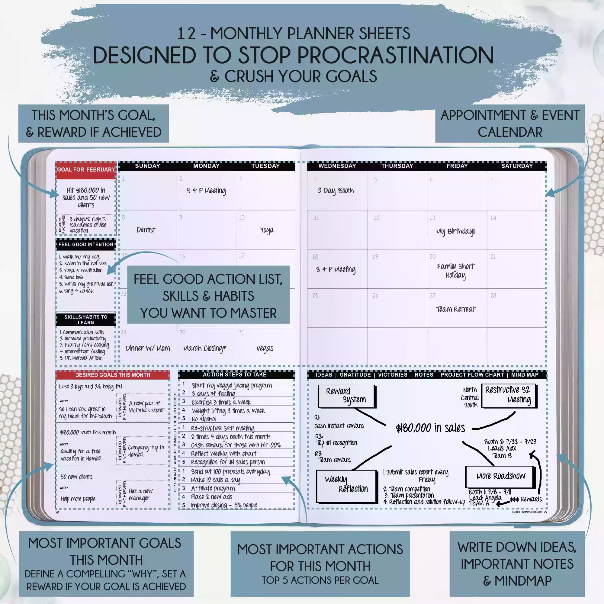 💎 ACHIEVE YOUR GOALS AND IMPROVE TIME MANAGEMENT - Learn How To Set Big Goals and achieve them by improving your time management - Follow the same methods millionaires and billionaires around the world follow to set goals and achieve them. You will be amazed by the results if you follow the 8 steps in this planner! FIND YOUR LIFE PURPOSE AND LIVE YOUR PASSION - Discover what you truly want in your life. Following your passion and purpose will give you more joy than you ever imagined.